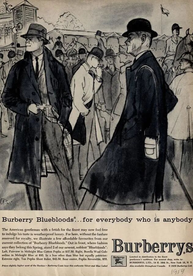 1910年,飞行员穿着Burberry,成为第一个用了不到二十四小时从伦敦飞到曼切斯特的人;1911年,探险队穿着Burberry去了南极;到了1912年,Burberry第一款风衣的雏形诞生了,当时的广告强调它抗风、雪和雨,防任何天气(Weatherproof);在1959年的广告上,我们看到它的风衣售价在37.5到95美元间,而当时的电影票1美元一张,面包20美分一打。