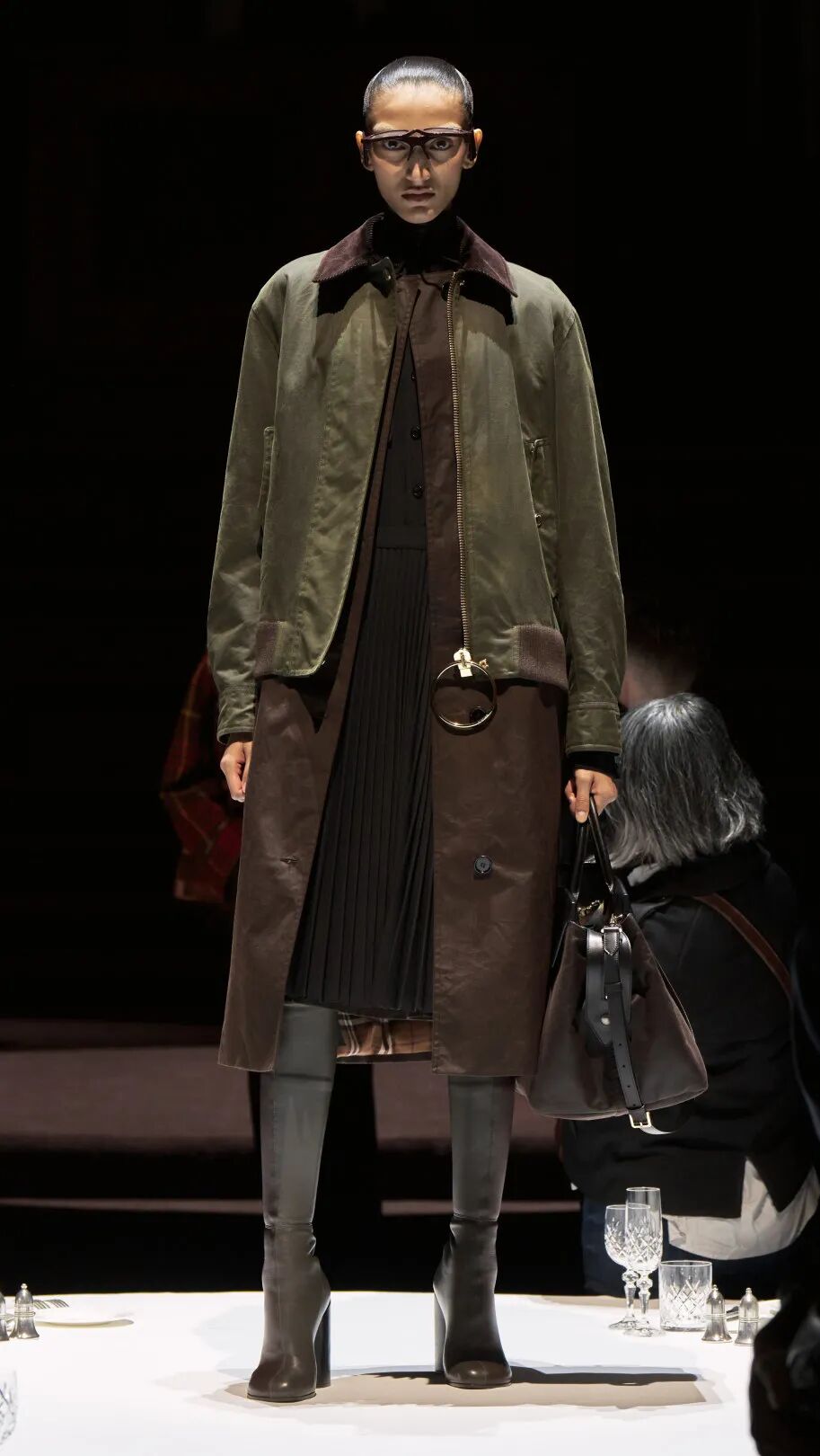 他还致敬Harrington夹克——这是一款传统的日常夹克。对付有风的季节,可以刚好将衣领立起来围在脖子一圈并扣上。Burberry在历史上擅长做这样实穿的外套,这一次Tisci先生用同色系的及膝裙去搭配它们。