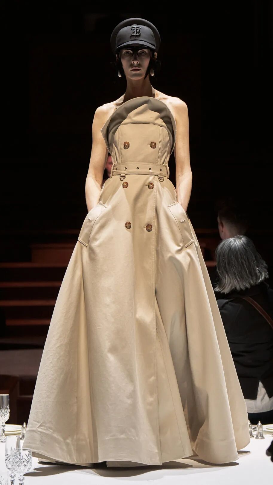 他也不断尝试解构Trench风衣,这一季让其变成优雅的“晚风衣”。Trench风衣的棉质嘎巴甸(Gabardine)面料应用于礼服上,如同调节风衣,同色系和材质的腰带从礼服正面垂下来,或像腰带一样从正面提高腰线的位置。