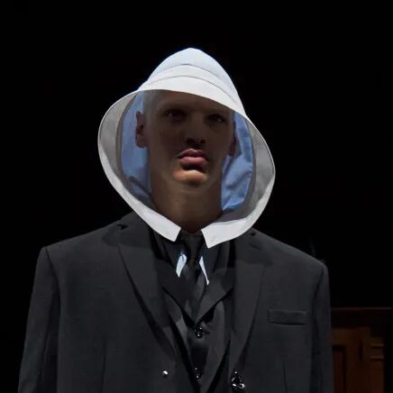 是真实的餐桌,一丝不苟地布置了餐具,甚至可见盐和胡椒。这个私人餐厅的布置让人想到美国的“食物艺术家”Jennifer Rubell用食材和餐具创作的装置艺术。两侧有伦敦当代管弦乐团现场演奏,合唱团由100位成员组成,比走秀的模特都还要多。