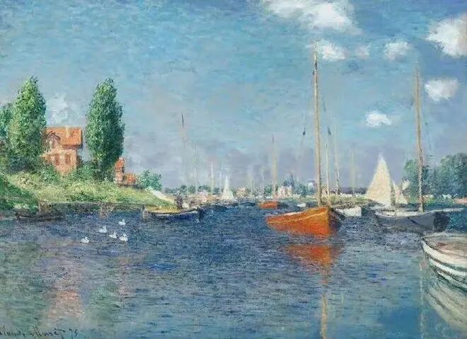 1875年前后,莫奈对光的处理有了更大胆的尝试。他对阿让特伊港的描绘,也更加完整准确。