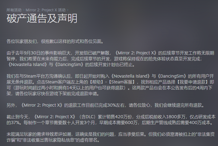 如果你稍微了解点独游开发,就会马上品出这份通告处处都透露着一股不对劲。按照官方说法,《Mirror 2》总计销量420万份,分成后税前收入1800万元,仅占研发成本的37%。也就是说,按照他们的预想,《Mirror 2》至少是一款有着4865万元成本的黄油,哦不对,是R16级别游戏,尊称一声“国产3A”不过分吧?