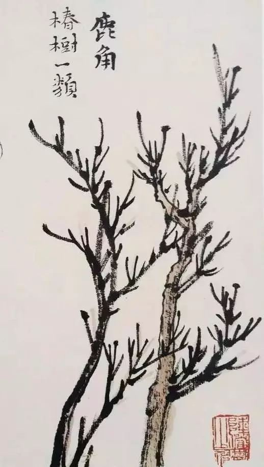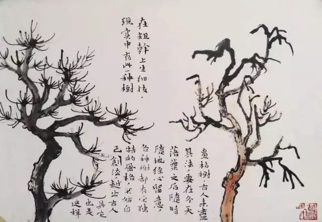 在粗干上生细枝,现实中有此一种树。画枯树,古人未尽其法,要在冬天落叶之后随时随地经心留意,各种树都有它独特的风格,不妨自己创法,越出古人,其他也就这样。