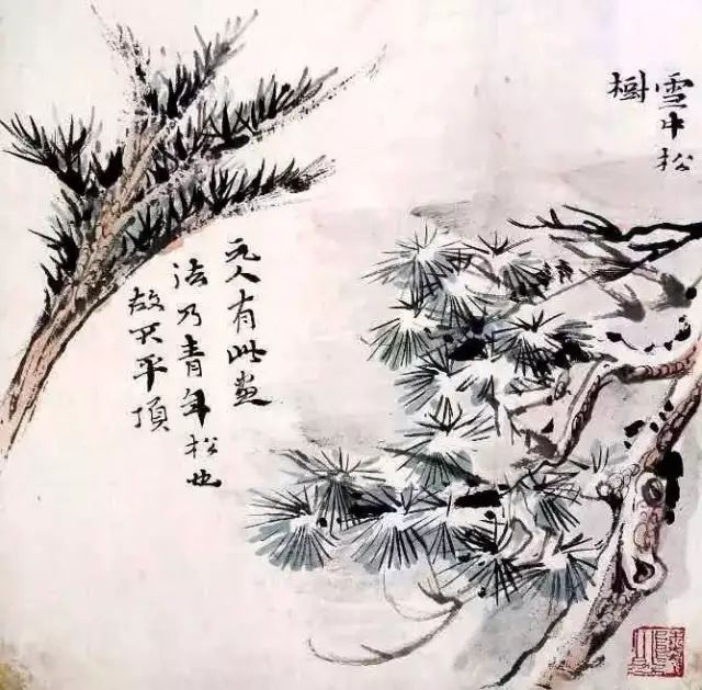 雪中松树。元人有此画法,乃青年松也,故不平顶。