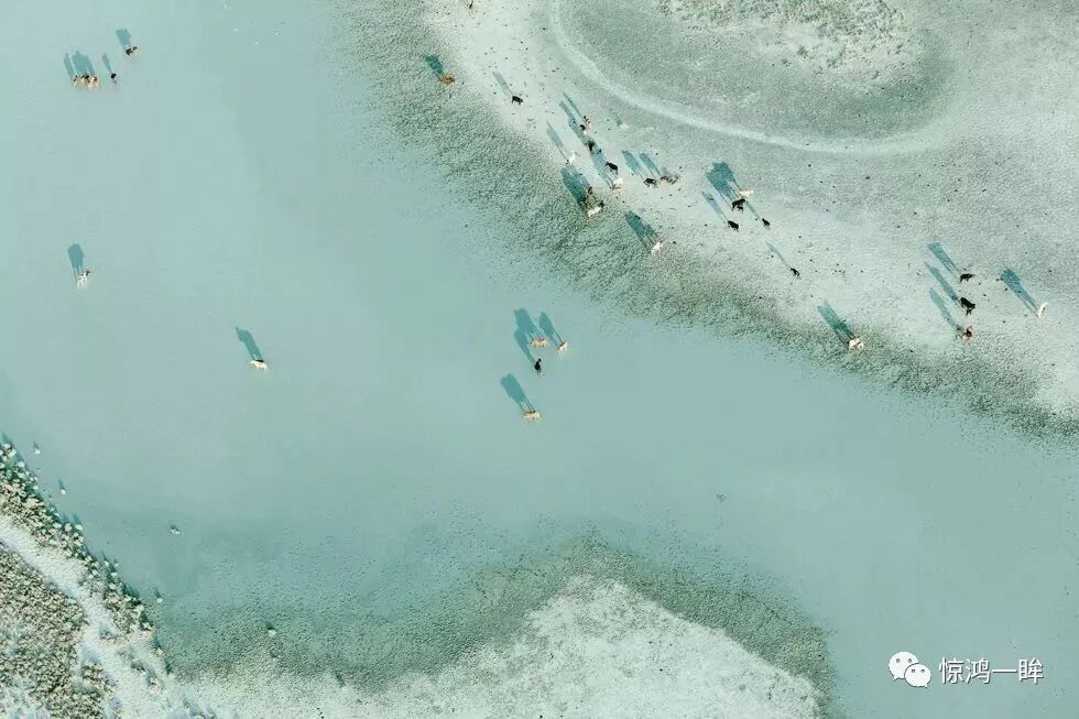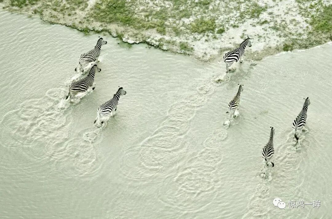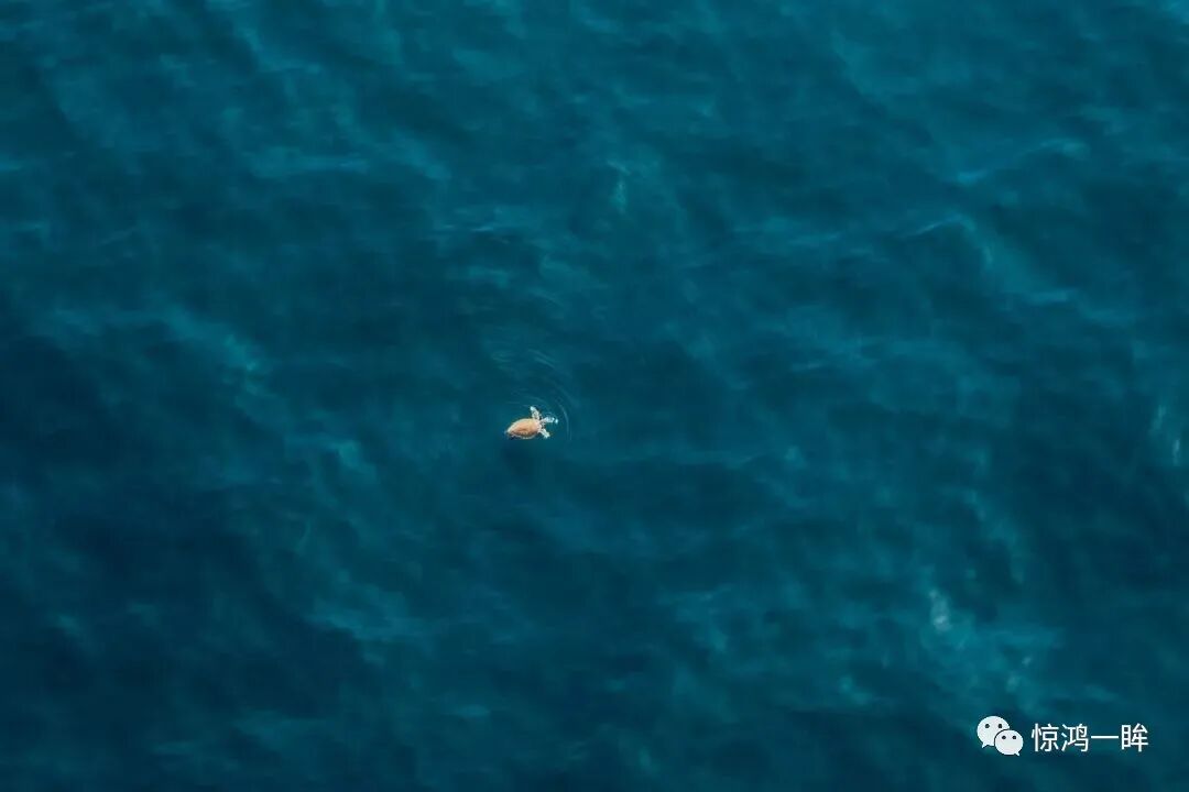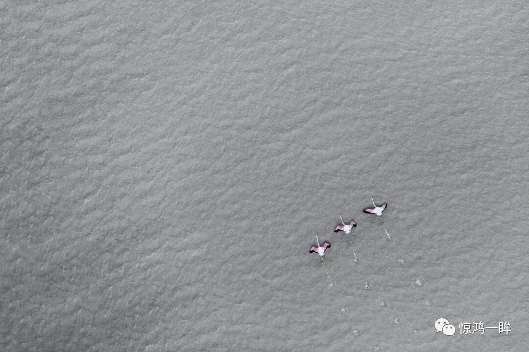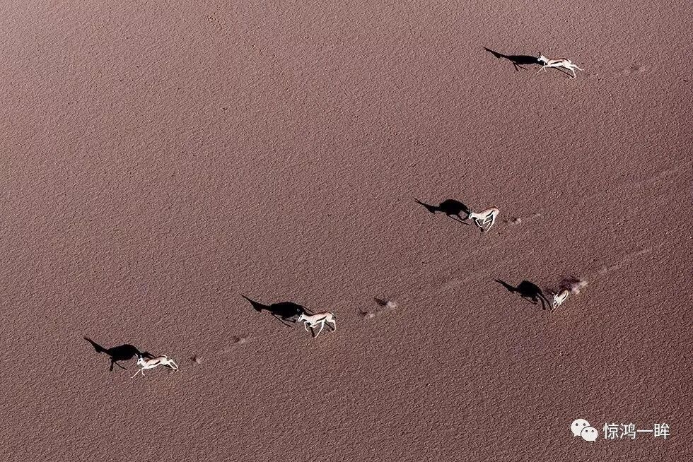 如火烈鸟、好望角大羚羊、甚至是一只在蔚蓝的海水中休息的乌龟。动物们行进时留下的痕迹和阴影都是他作品中重要的组成元素。
