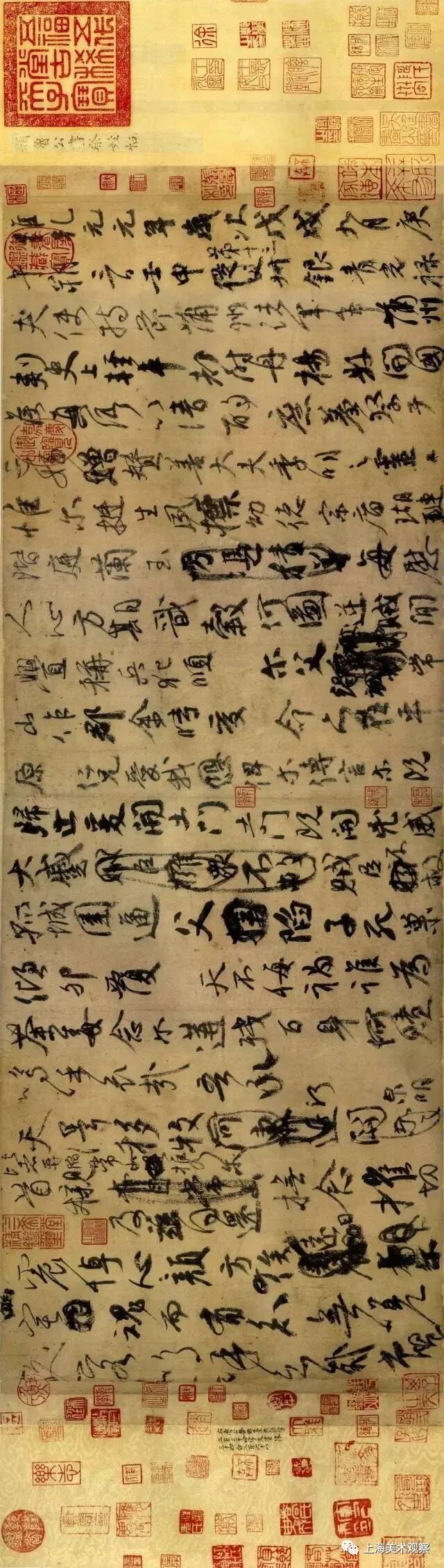 书法渊源流传数千载,其中精品为历代文人保藏。尤其是宋明之前的书法作品多是长卷形制,书法随着书家感情的宣泄和转移而不断的由缓及促,墨色也会由润至躁不断更迭,这或许就是书法的节奏与美感所在。
