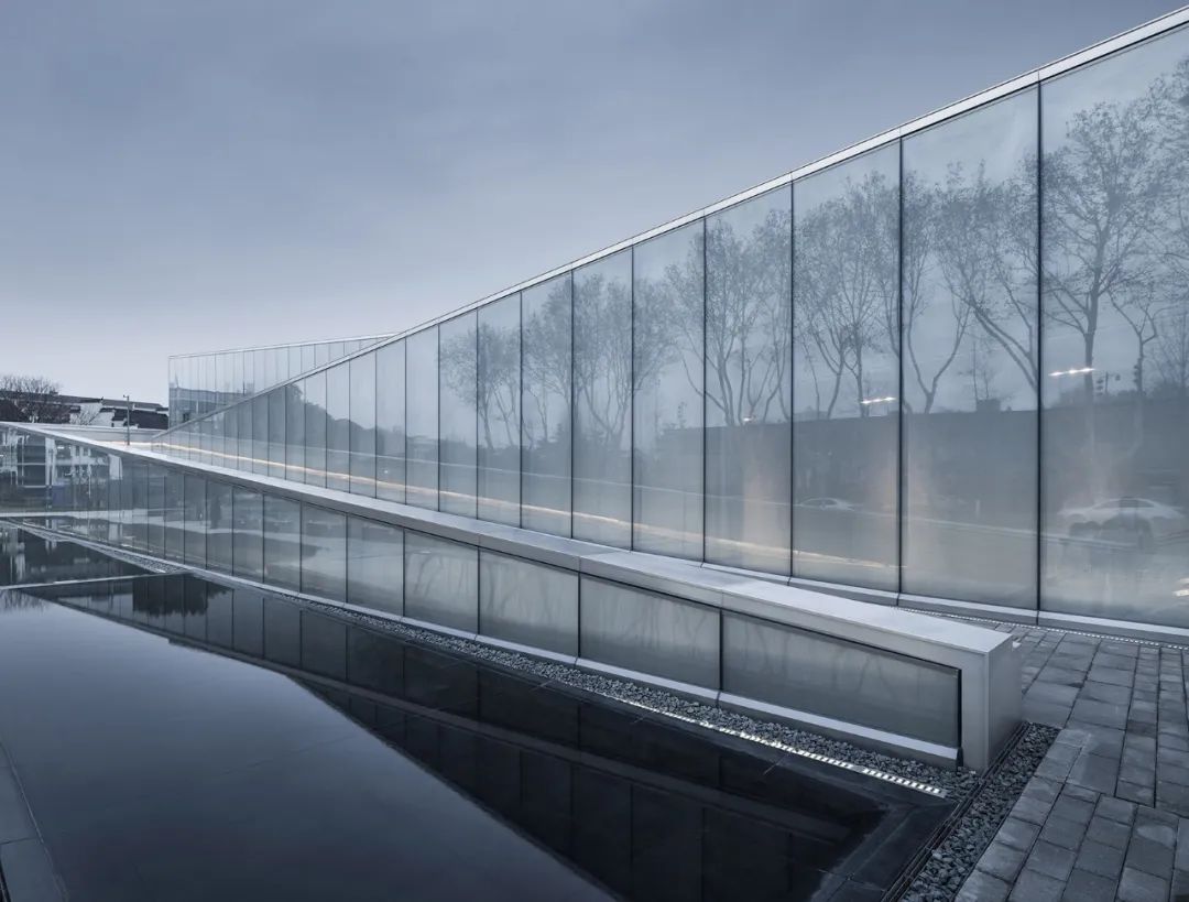 博物馆周边各种不同时期所形成的自然条件、历史遗存以及建筑形态,构成了复杂而多元的城市肌理。博物馆的外观希望通过模糊映射的方式,让博物馆消隐建筑体量,同时收纳着周边的环境反馈。表皮材料采用夹丝反射玻璃,自外而内看,模糊映射,相融共生,自内而外看,清晰透明,新旧对话。
