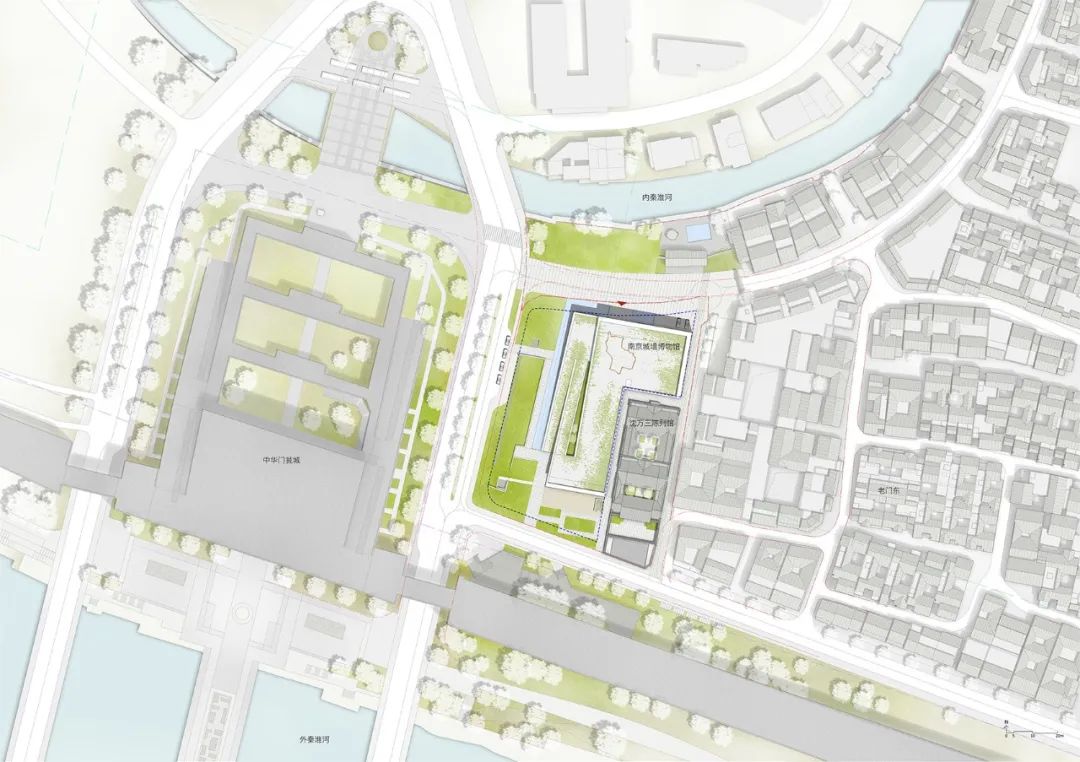博物馆入口连续的绿化广场设置城墙主题展示节点组群,市民在博物馆闭馆时也可以从外部沿坡道登上屋顶,一览城墙、秦淮河与大报恩寺塔风光,让博物馆真正地成为面向公众开放的城市公园,成为举办各种庆典活动的文化集散地。