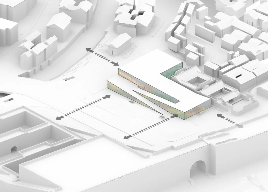 博物馆的形体设计试图将古城墙的马道、平台等元素加以提炼,形成近城低,远城高的自然态势;反向攀升的坡道,连接高低错动的平台,与古城墙的马道形成和谐统一的形体语汇。