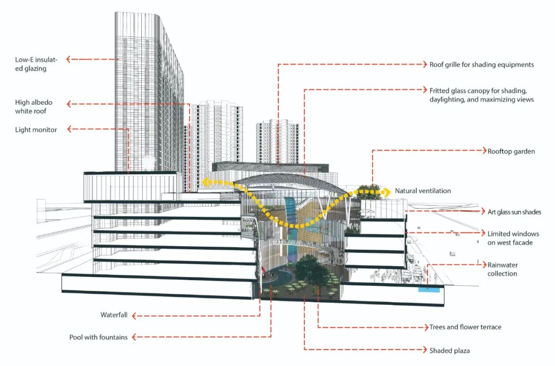 城市体育公园向公众开放,并为街道对面的学校社区提供各种活动场所。购物中心内的社区广场成为音乐会、现场表演、音乐喷泉等的核心空间,场地不受购物商场营业时间的影响。建筑南部和北部沿街立面都有进入室内购物中心或室外下沉式广场的入口。人们可以随意出入,增强了沉浸式的游逛体验。