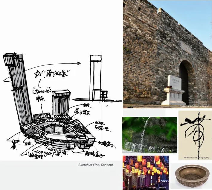 项目坐落于江北新区,其设计希望能把古都南京的历史名城底蕴带到城市新区。建筑造型以“南京印象”为设计概念,运用了南京本地的明城墙、聚宝盆、龙吐水等建筑元素来打造商业空间,塔楼幕墙和塔冠运用了当代草圣林散之(浦口人)的枯笔书法笔意来设计,是有识别感的标志性形象。凯悦酒店空中大堂放置在酒店高区,向北看江北新区核心区,向西看老山,向东看长江,尽享城市美景。