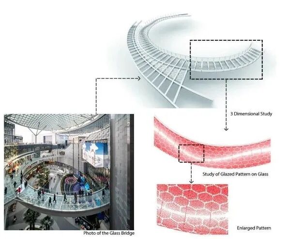 参数化设计用于向桥面钢化夹胶玻璃表面两侧,使得玻璃呈现半透明效果,走得越中心,其透明度就越高,增添了奇幻的过桥感受。六边形图案为空间增添了梦幻感和立体感,为整体设计提供了亮点。