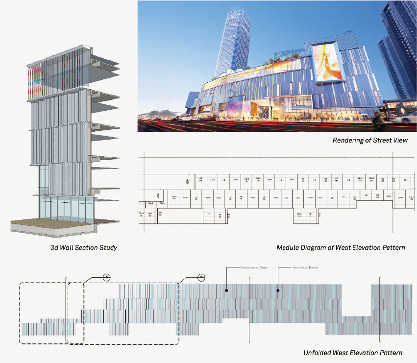 龙华路主立面特殊造型由凹凸铝板和半透明玻璃组成,这种看似随机生成的排布实则内含逻辑。为使其有节奏感又不失规律,设计方对其进行了模块化组合然后简化成四个基本模块以便于安装,每一模块由不同大小的金属和玻璃进行组合,沿立面依次排列创造出了一种生动的效果,就像丝带在风中飘扬。
