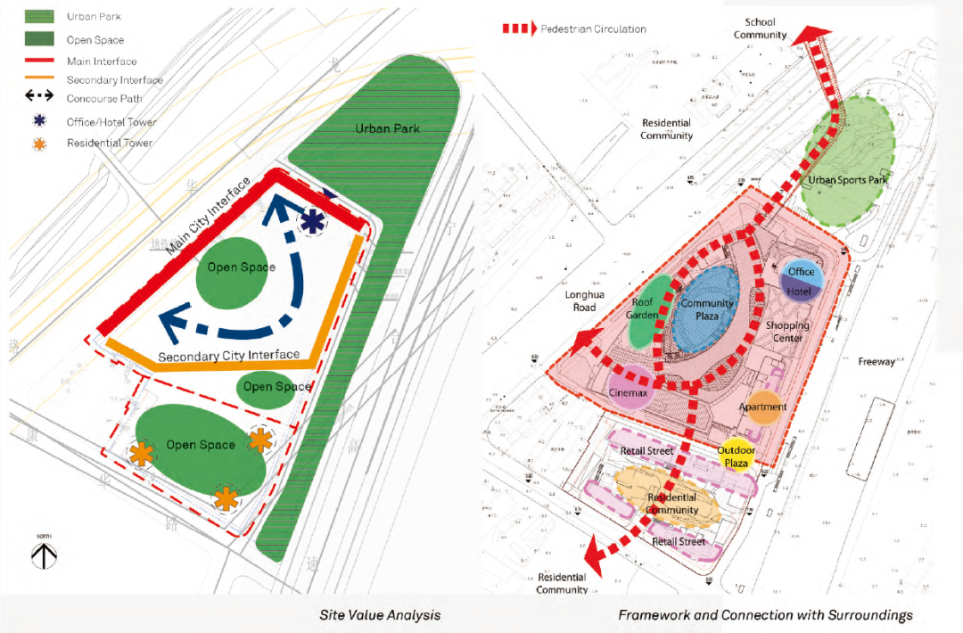 商业建筑毗邻城市主干道龙华路,为便于城市客流出入,商业建筑的主入口设置在了的龙华路南北两端。购物中心主体呈U形延伸贯穿场地南北长轴,最大化利用了龙华路沿线商业界面,也最大限度延长了购物空间的内部动线。