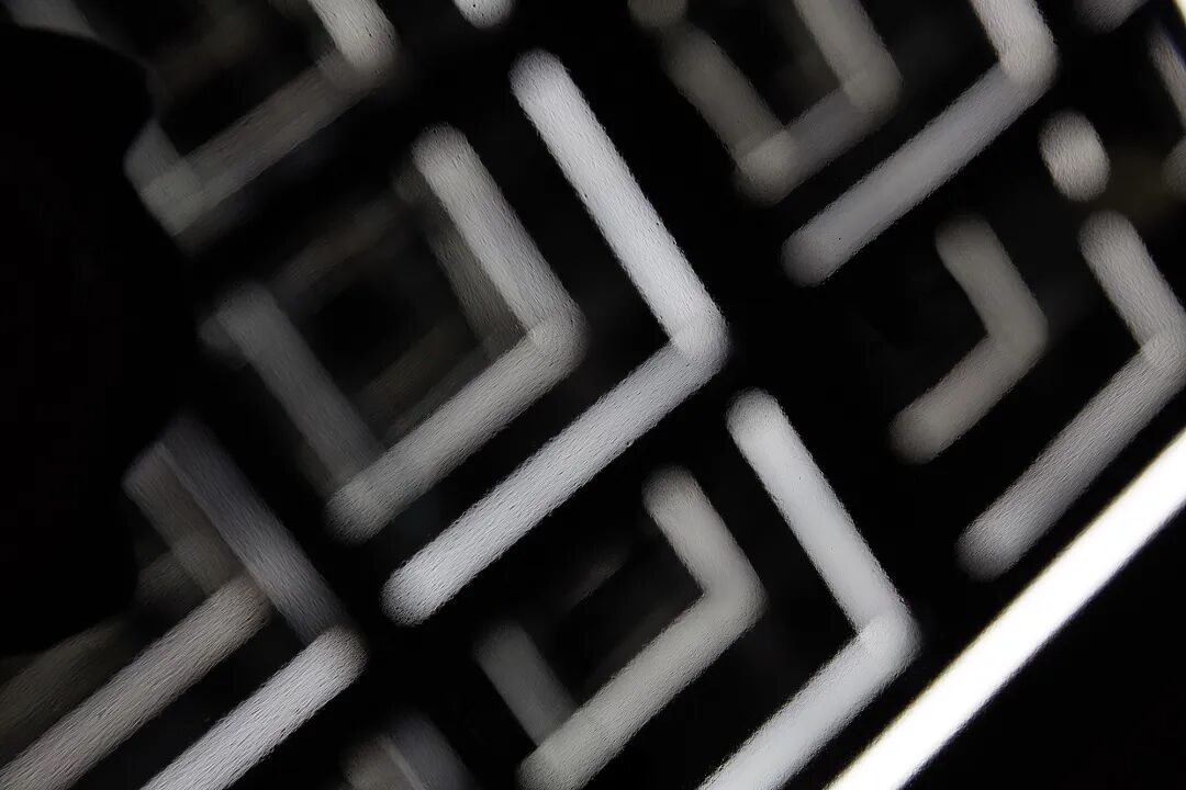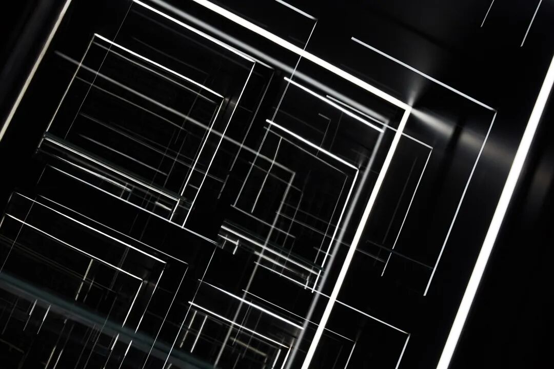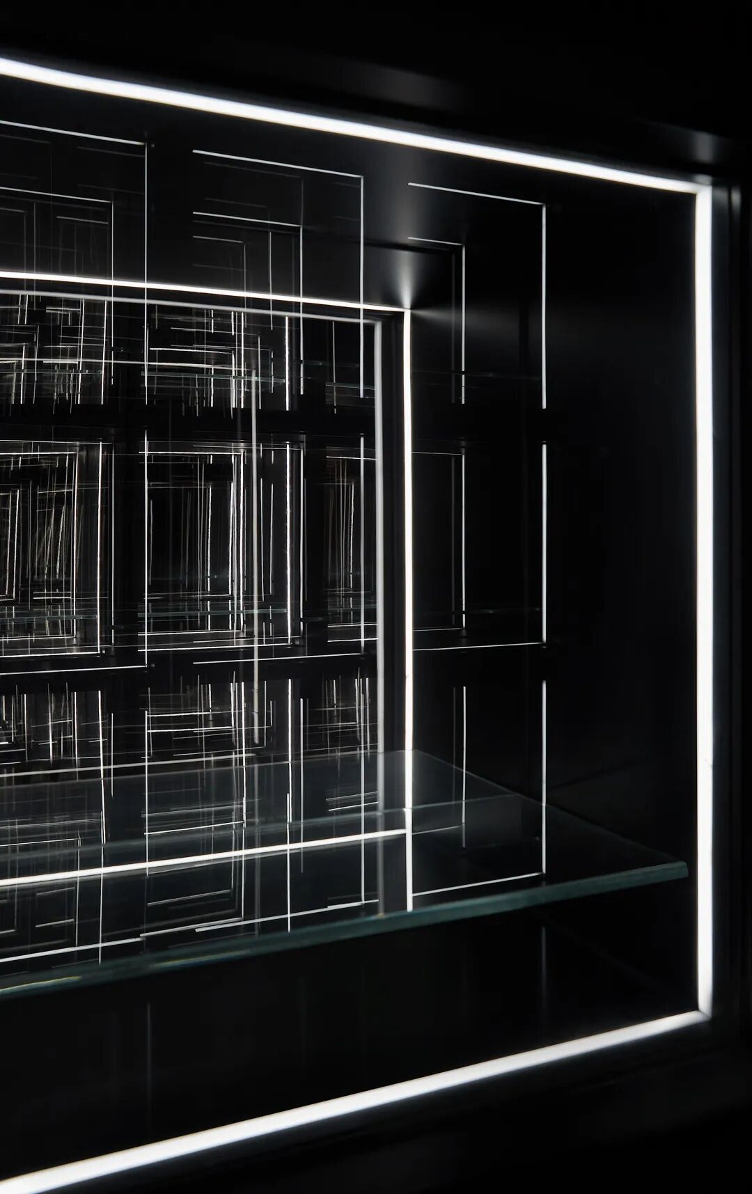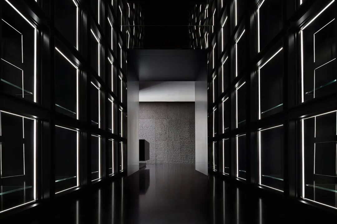 逐光而行,展示中庭巧用线条、比例,两侧置以透明格架对称而立,延伸至顶部的不锈钢镜面与灯带的多维交织,似乎令这一领域无限扩容,酷炫非凡。