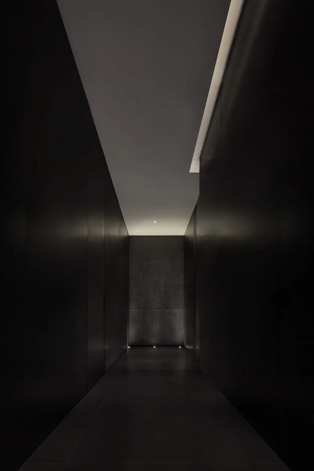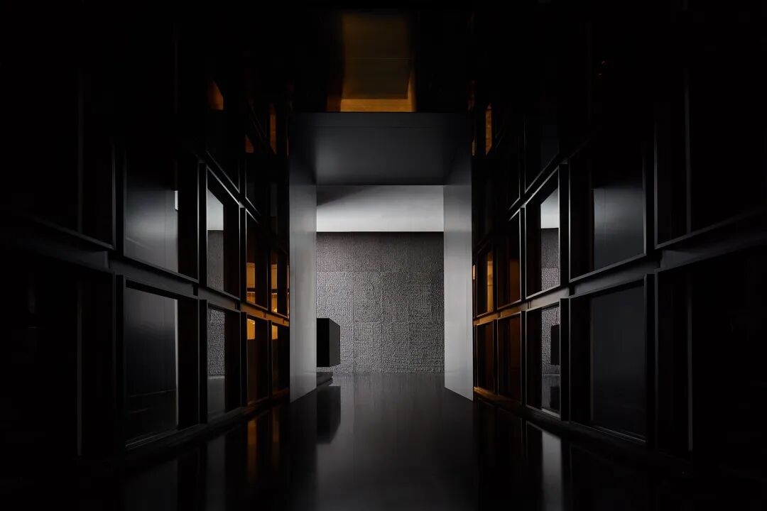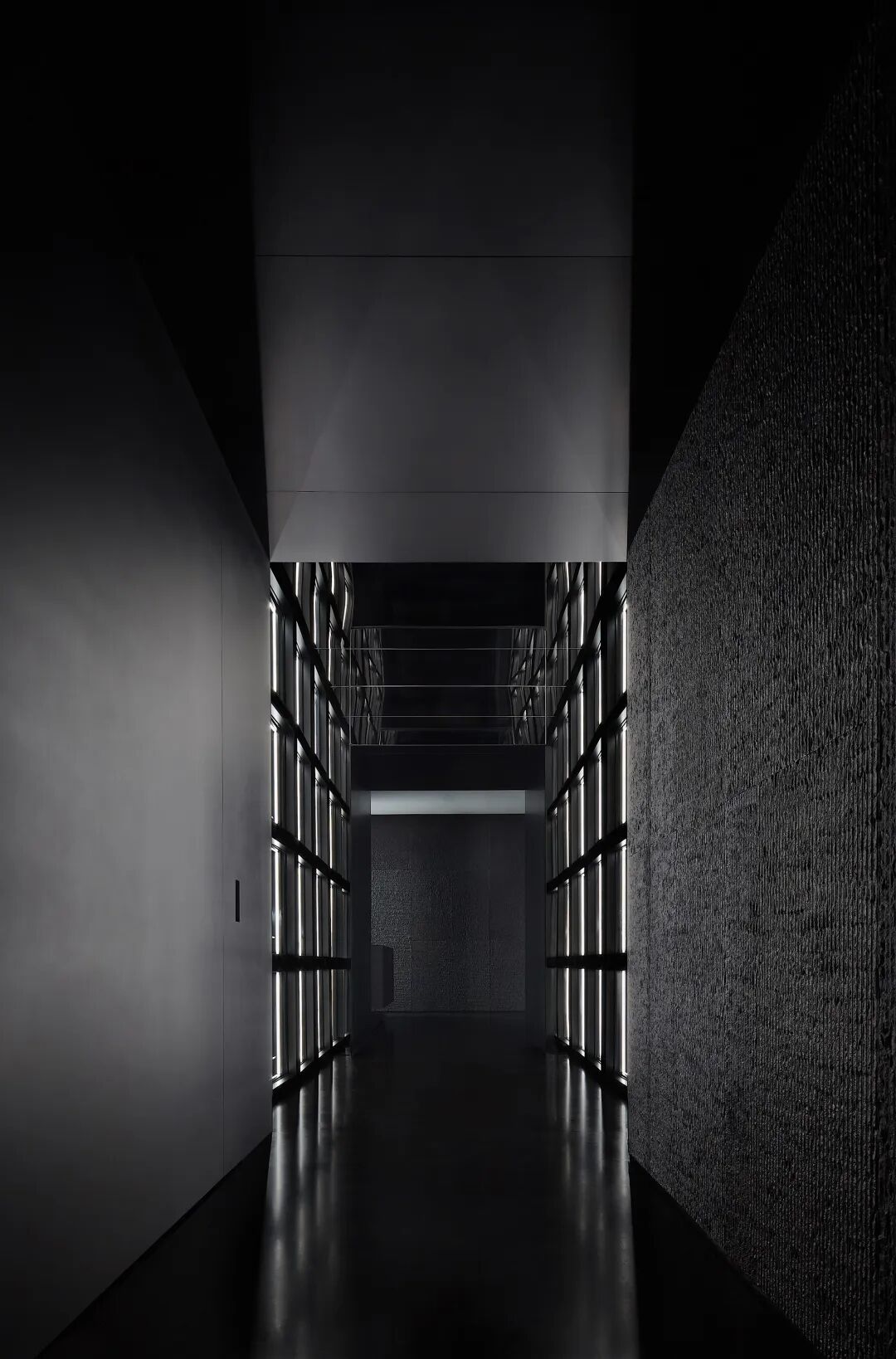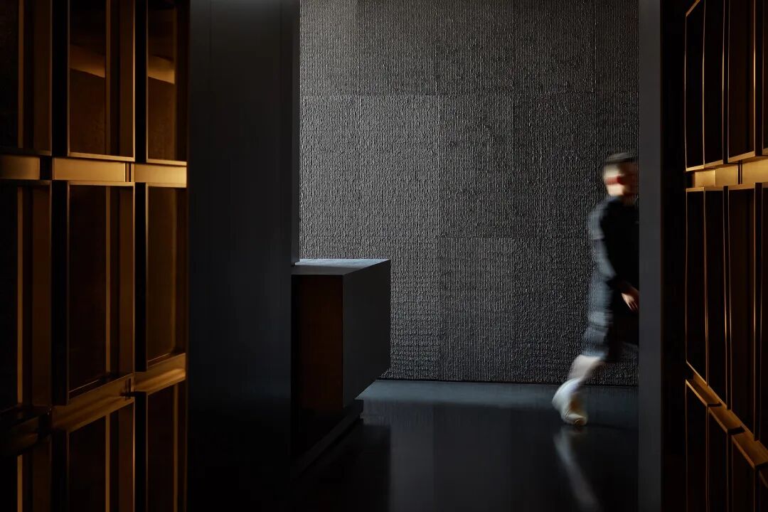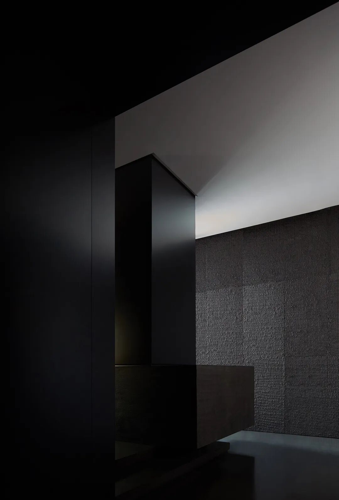 从门廊至展示中庭,再至接待前厅,以先抑、后扬、再抑的节奏把控,逐步指引宾客置身静谧之中。以物理空间的循序渐进,达到对心理层面的融通契合,一切显得自然而然。