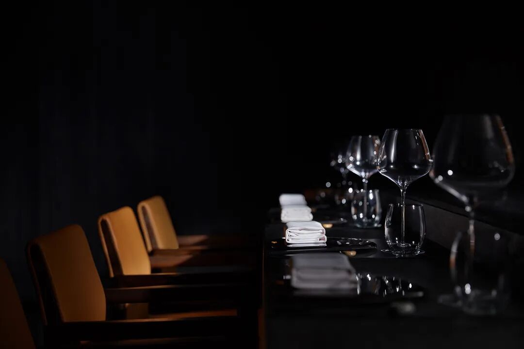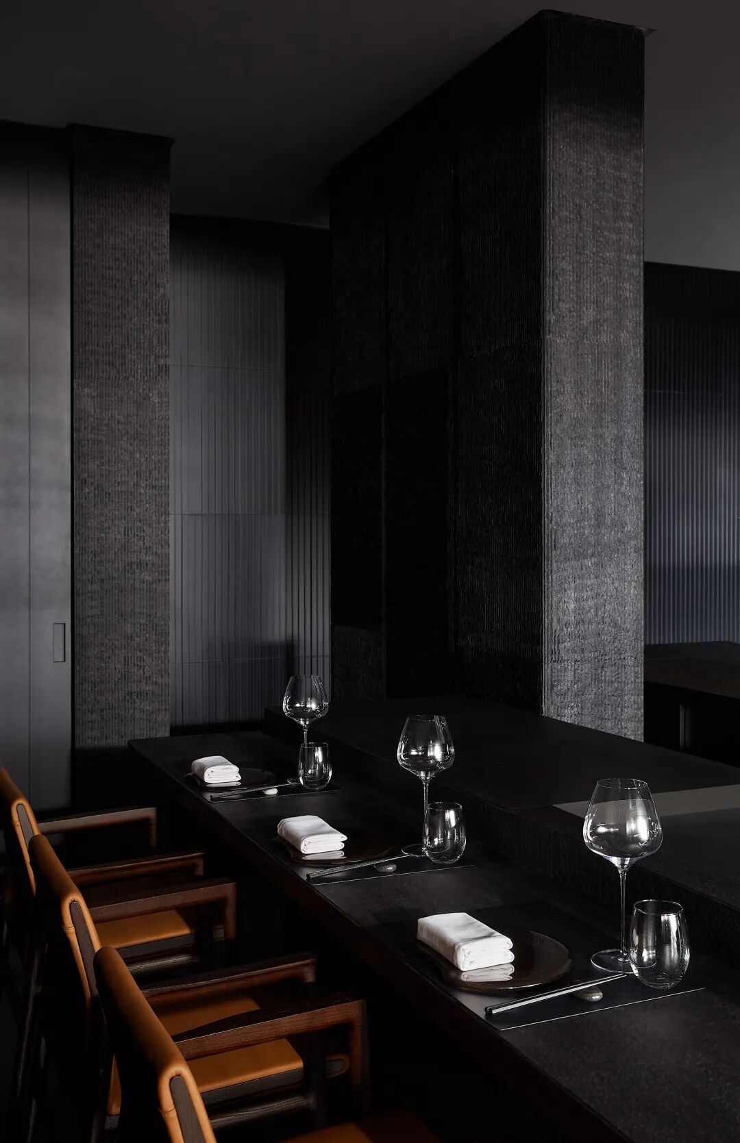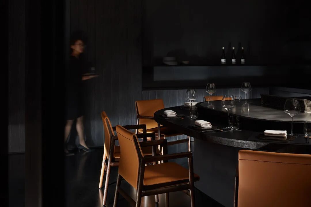 设计师从外形、视野、触觉等不同维度落笔,参照独立墙体,将动线、操作区、就餐区进行相应规划,营造出全方位沉浸式体验。整体呈环绕式布局,避免了过度设计,也充分尊重动作尺度与场景需求,以便更及时便捷的响应对宾客的服务。