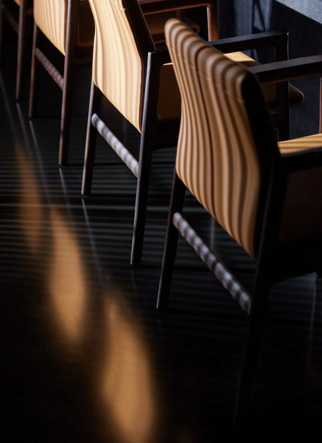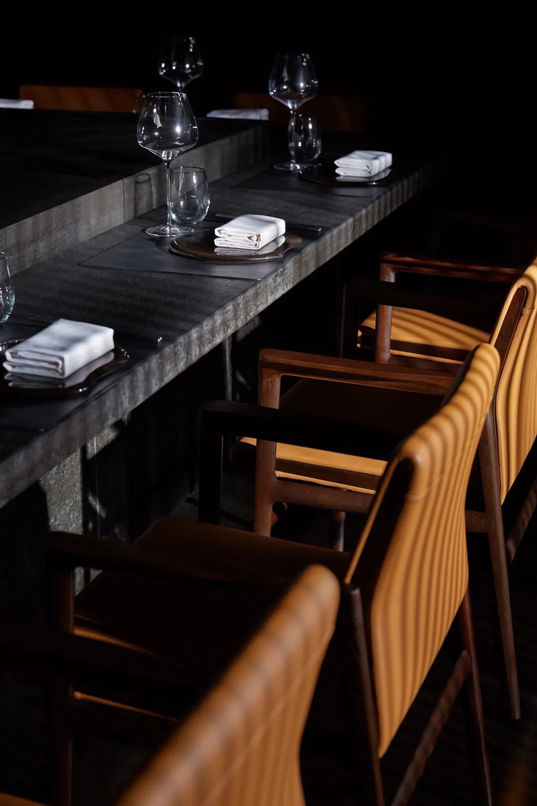 整个就餐区色调统一,间或些许跳色,木质、石材、金属、皮革等相互碰撞,近可感受肌理质感,远能一览结构轮廓,在光线和视角的转换之下,意味深长。