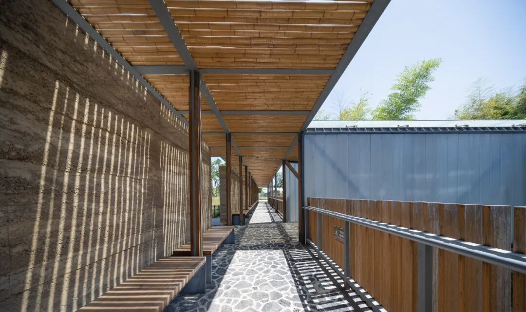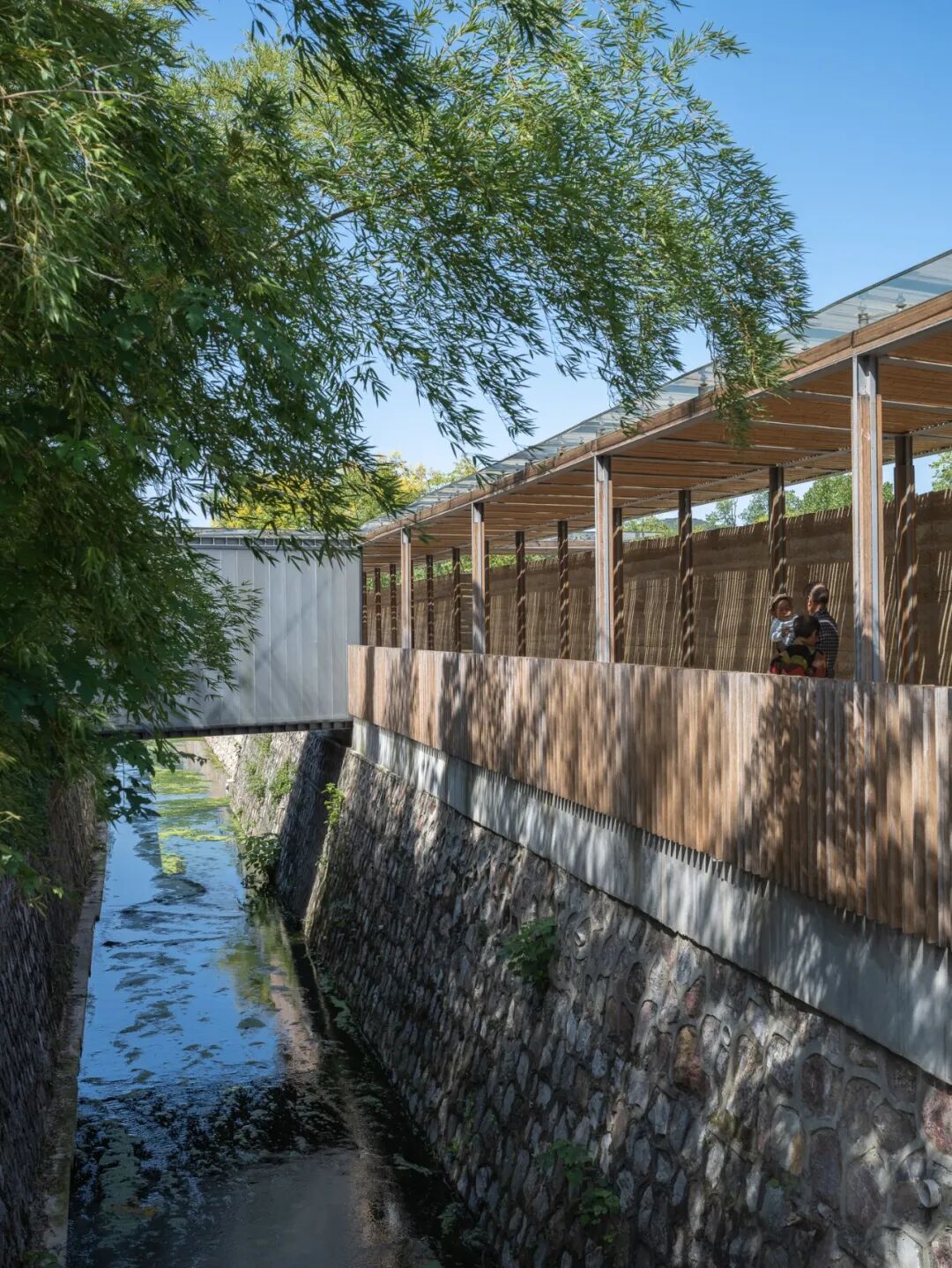 在顺渠的钢廊下,一排长椅倚靠在长长的土墙根下,渠成为被观赏的对象;而在对岸保留的竹丛下,有两处供人休憩的拐角坐凳,午后于此躺卧小憩甚是惬意。