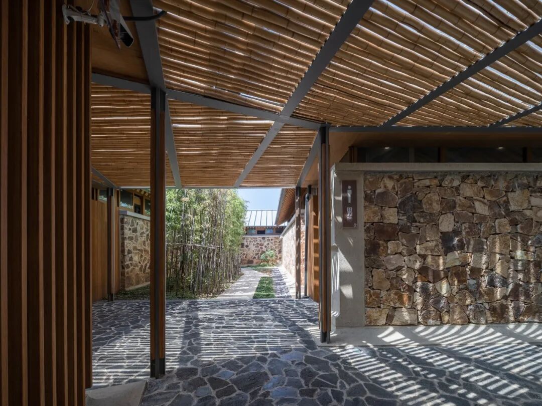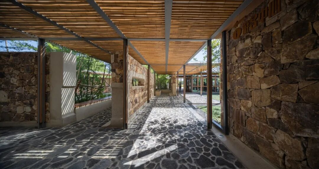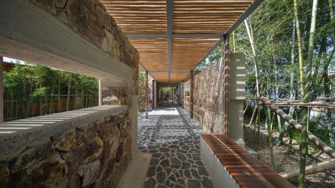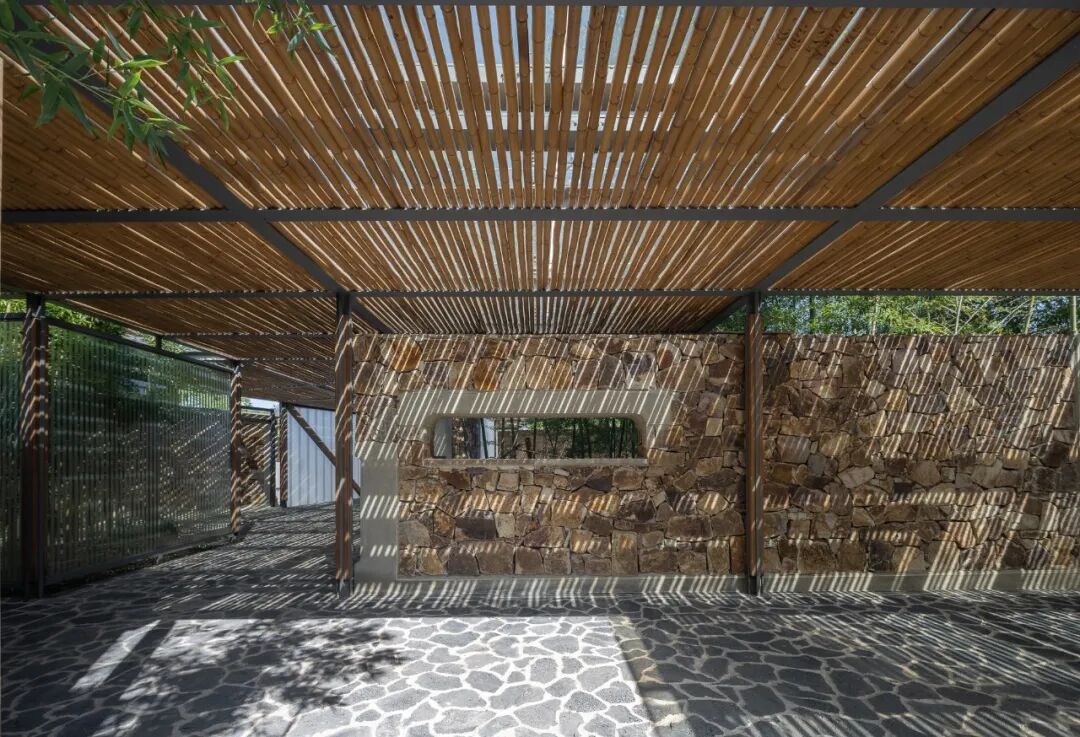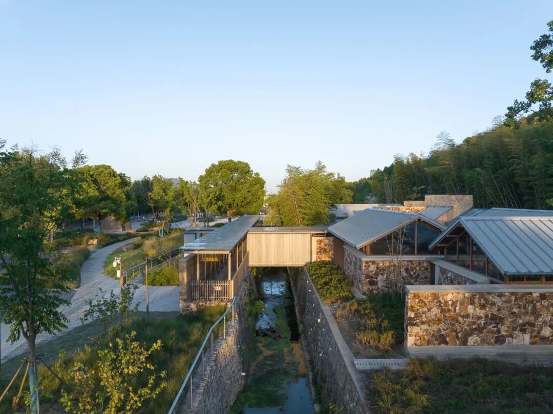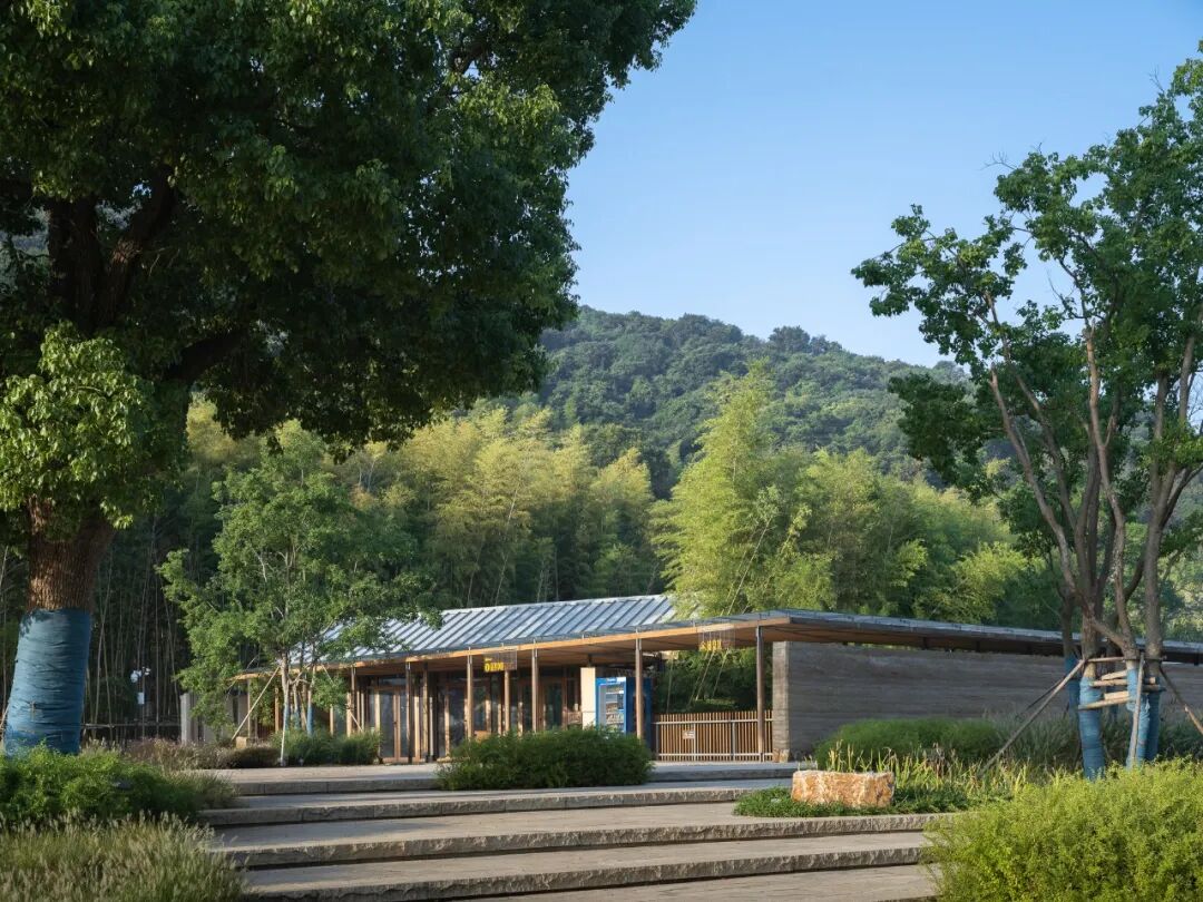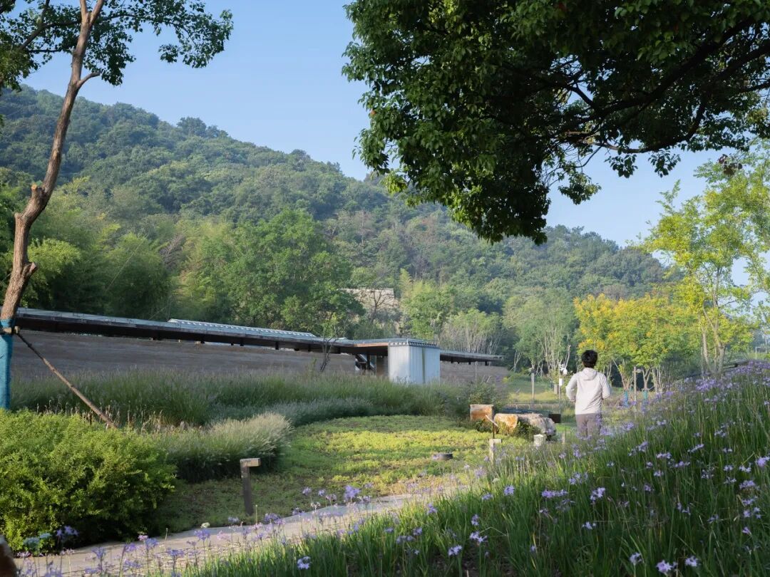 项目于 2019 年建成了,最初的设想的功能是景区的售票处和公共卫生间,为此还特地设置一个潮汐卫生间区域——平时关闭,高峰时可以灵活的并入男厕或女厕来使用,以此来解决景区在高峰期如厕难的问题。谁知 2019 年底新冠疫情爆发了,游客驿站投入使用的计划搁浅了,这一搁就是三年,这三年中景区的定位也发生了很大的变化,山脚下的入口区域全部作为了城市公园面向周边社区居民开放,建筑的功能除了保留卫生间之外,剩下的功能也调整为游客休息水吧和物业管理用房,但建筑的结构形式赋予其适应性非常强的空间去适应新的调整。我印象想特别深刻的是建成后我对它的一次造访,由于无人使用,各种植物开始漫入建筑,整个建筑呈现出一种质朴而野生的状态,当时正值暑期又受困于疫情无法远行,我静静地坐在这渠边,整个人被笼罩在蓝天、光影、土石、植物之间,仿佛置身于大理。