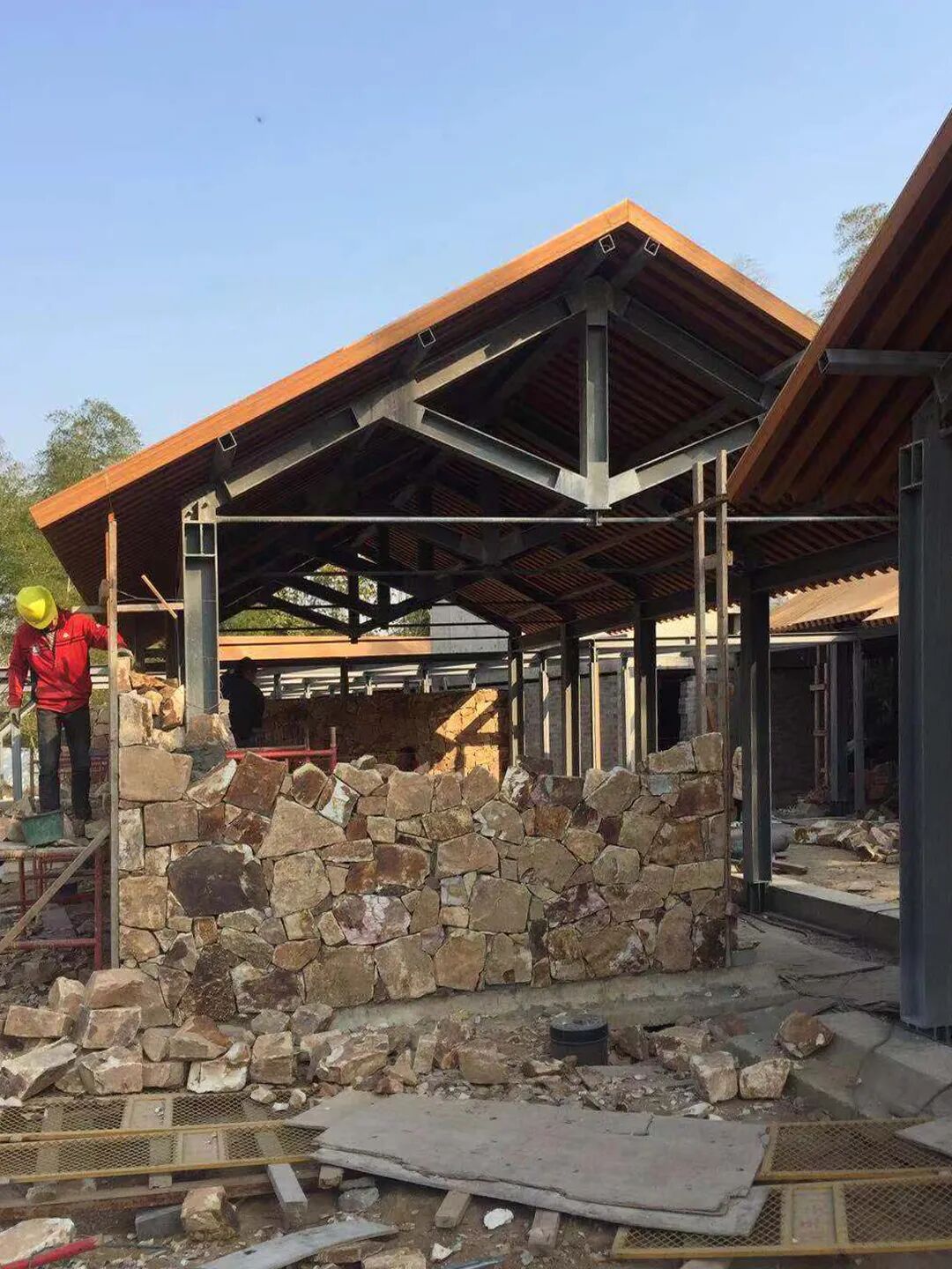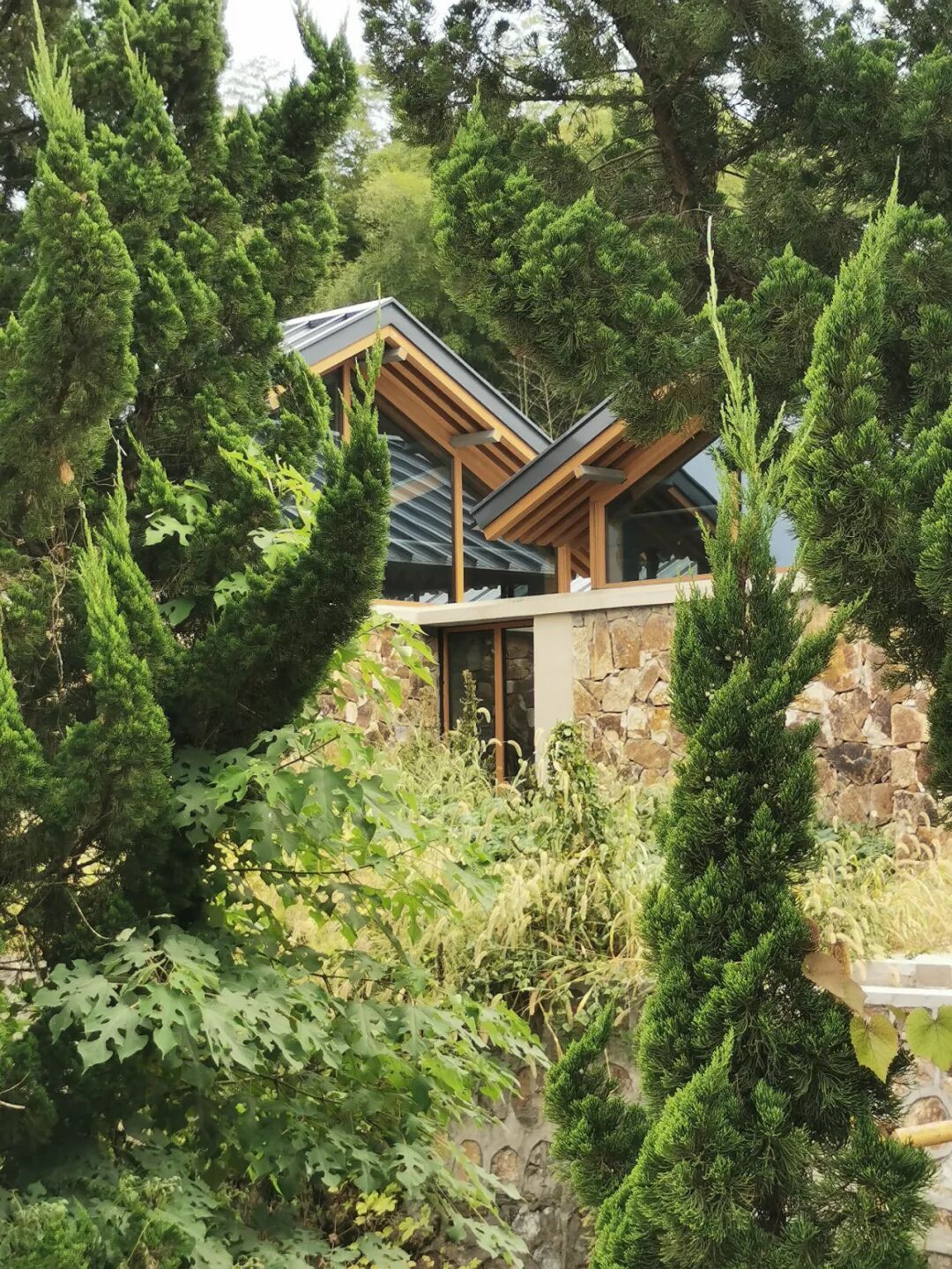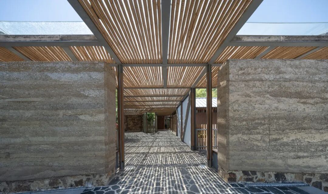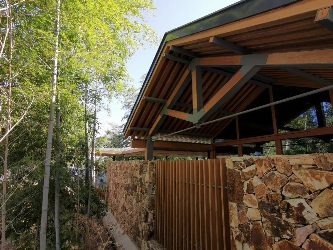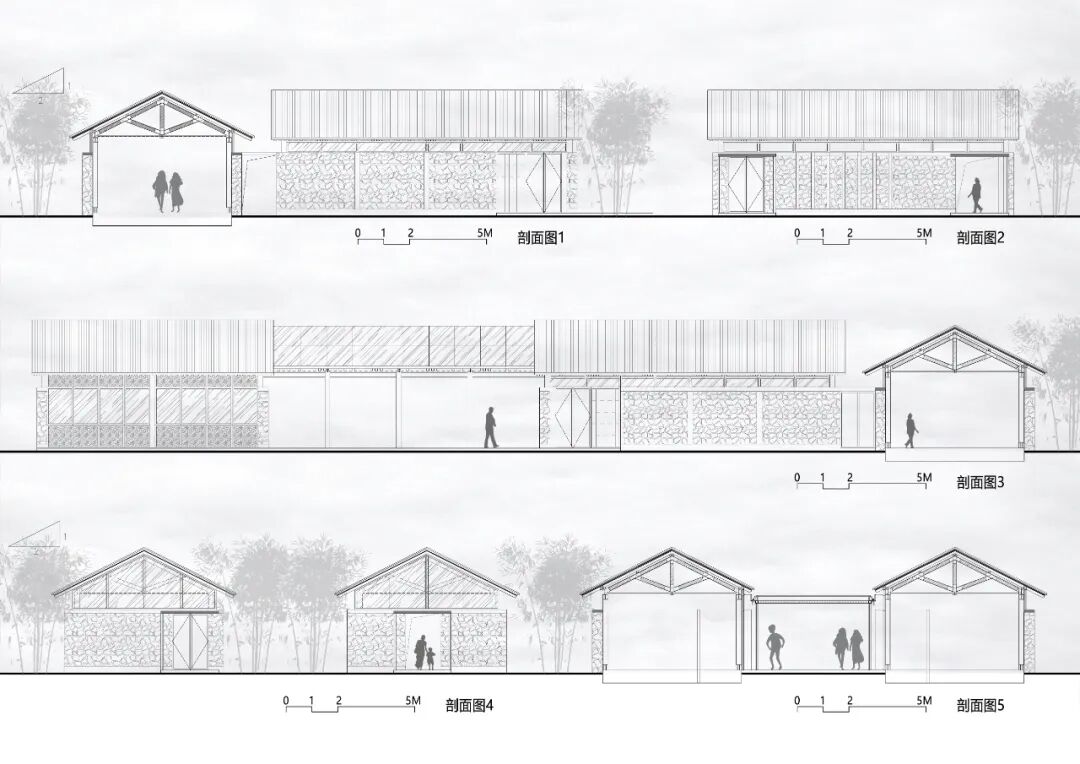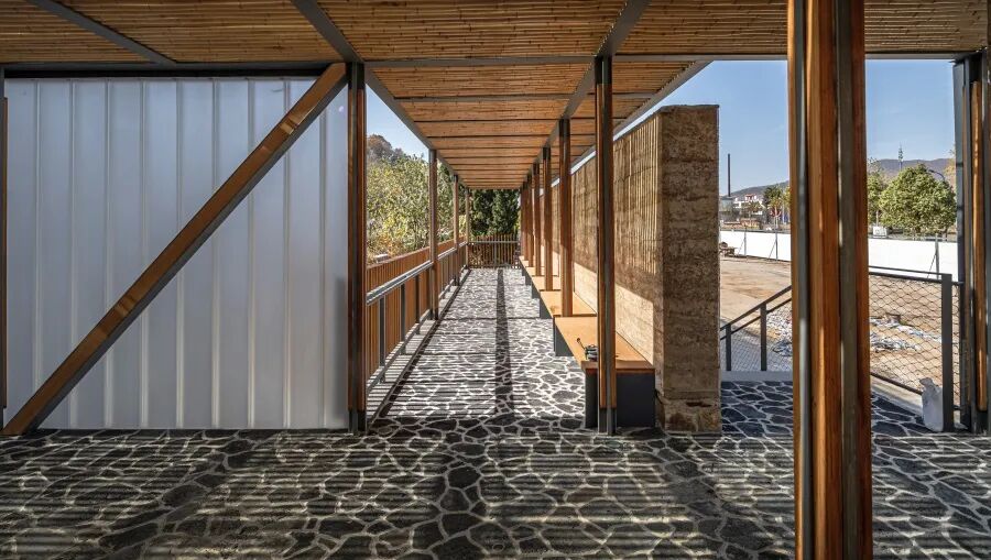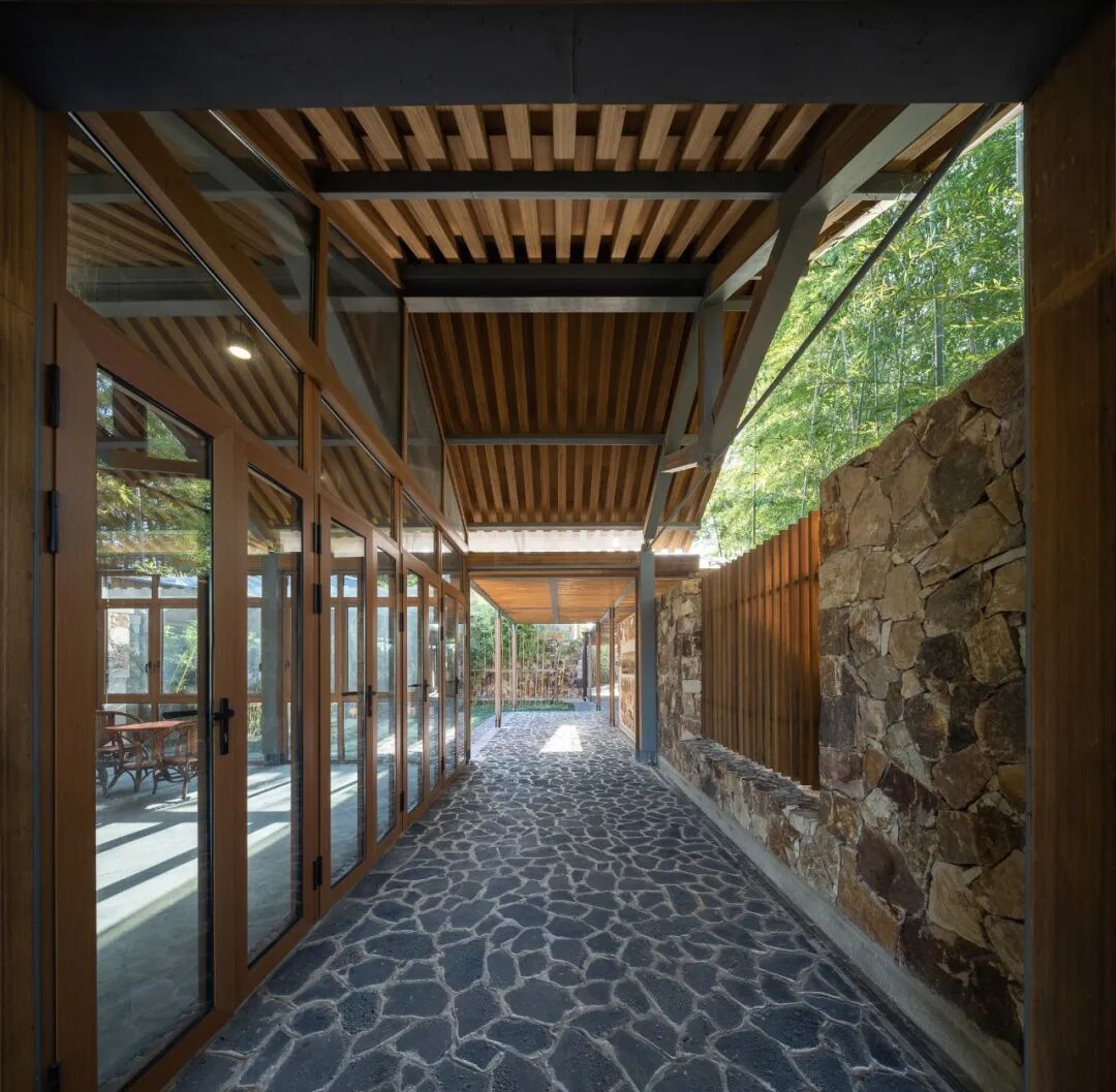 项目于 2019 年建成了,最初的设想的功能是景区的售票处和公共卫生间,为此还特地设置一个潮汐卫生间区域——平时关闭,高峰时可以灵活的并入男厕或女厕来使用,以此来解决景区在高峰期如厕难的问题。谁知 2019 年底新冠疫情爆发了,游客驿站投入使用的计划搁浅了,这一搁就是三年,这三年中景区的定位也发生了很大的变化,山脚下的入口区域全部作为了城市公园面向周边社区居民开放,建筑的功能除了保留卫生间之外,剩下的功能也调整为游客休息水吧和物业管理用房,但建筑的结构形式赋予其适应性非常强的空间去适应新的调整。我印象想特别深刻的是建成后我对它的一次造访,由于无人使用,各种植物开始漫入建筑,整个建筑呈现出一种质朴而野生的状态,当时正值暑期又受困于疫情无法远行,我静静地坐在这渠边,整个人被笼罩在蓝天、光影、土石、植物之间,仿佛置身于大理。