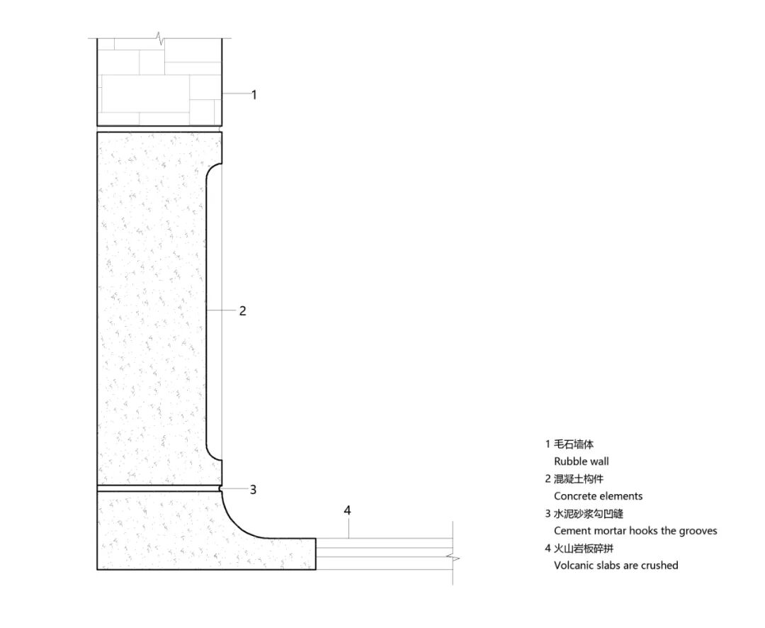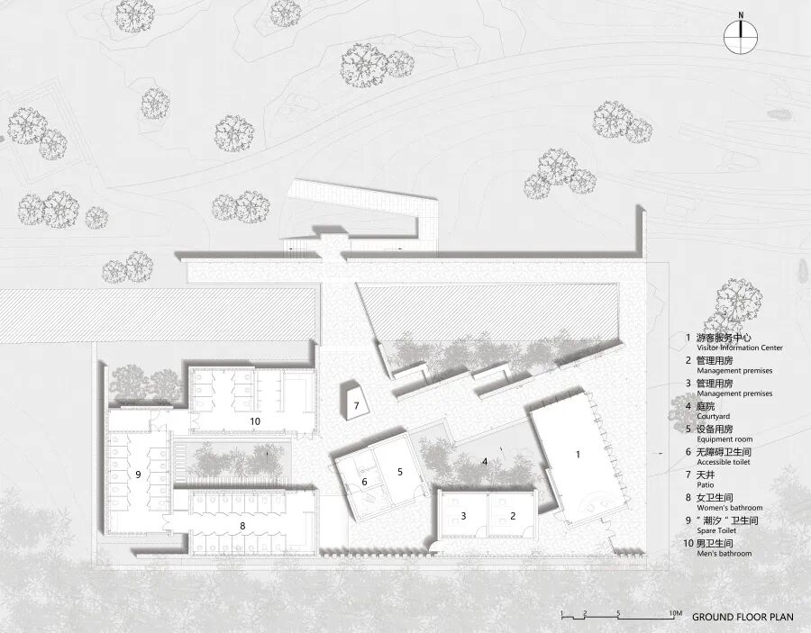 为了响应来自景区入口来向的流线,建筑的一些体量在东西方向做了一个小角度的扭转,从而产生出一些方向感模糊的空间,不同秩序的建筑体量间的碰撞,在某种程度上也干扰了游人对空间秩序的感知,从而产生出别样的体验感。