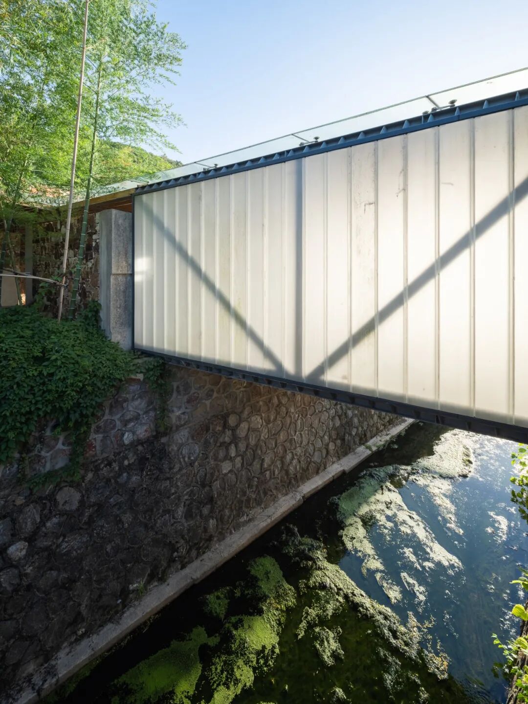 而跨越渠,依靠的是一个灯笼状的廊桥,这个形式是对之前跨在渠上的管理用房的呼应,这个由钢和U型玻璃构成的廊桥模糊了人的方向感和空间感,跨过这道渠仿佛进入到了有点陌生的场域。就好像第一次扒开灌木丛看到的秘境一般,我也希望带给后来使用者的,不是一眼看透的无趣。