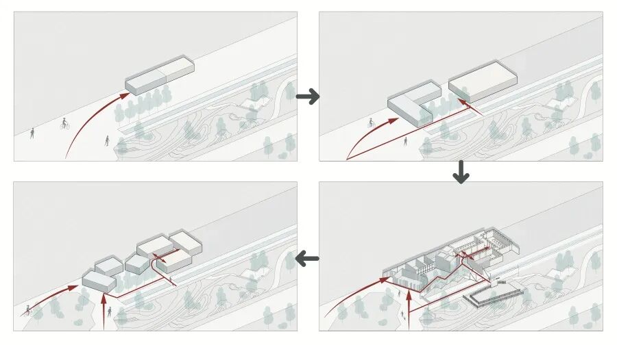 经过现场调查,我们判断出这块场地上存在两个来向的行为流线:一种是跨越渠的流线,主要是来自停车场的人群进入场地;另一种是来自景区主入口广场的人群进入场地。这两种近乎垂直的流线从头到尾不过 20 米,它们怎么才能在这块有限的场地上产生有趣的交织?