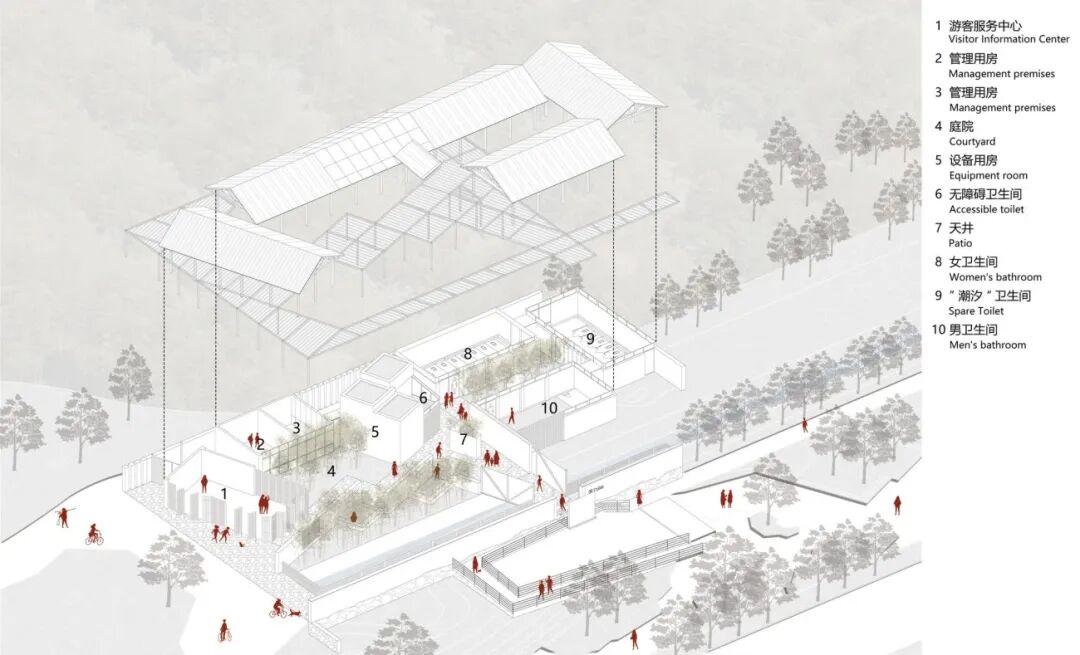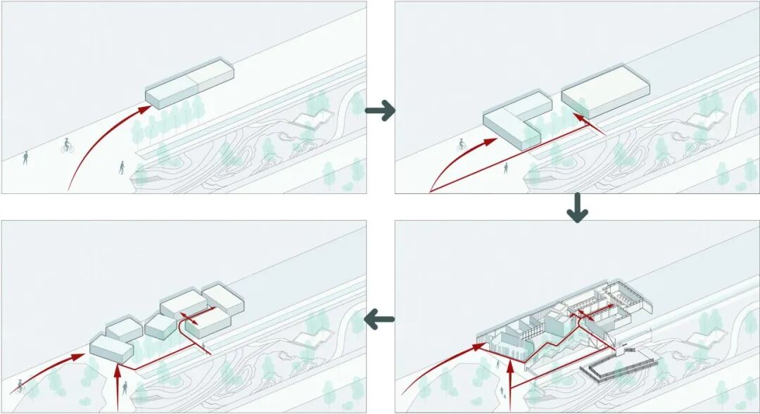 After on-site investigation, we judged that there are two pedestrian streamline on this site: one is across the canal, it was mainly the crowd from the parking area that entered the site; The other is the crowd from the main entrance square of the scenic spot entering the venue. How can these two near-vertical streamlines be only 20 meters from end to end to create an interesting interweaving on this limited field? In the design, we made full use of the cluster of bamboo bushes in the ditch and the canal, and uses the method of folding gallery in the garden that using twisting, masking to create three streamlines parallel to the canal. The three of them are the rest and waiting streamline in the north side of the canal, the streamline to the toilet along the south side of the canal, and the internal office streamline close to the bamboo forest respectively. In response to the streamline from the entrance of the scenic spot, some of the volume of the building has been twisted at a small angle in the east-west direction, resulting in some space with a blurred sense of direction, and the collision between the building volumes of different orders also interferes with visitors' perception of spatial order to some extent, thus producing a different sense of experience.