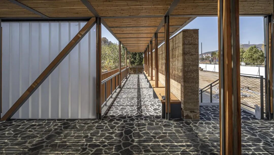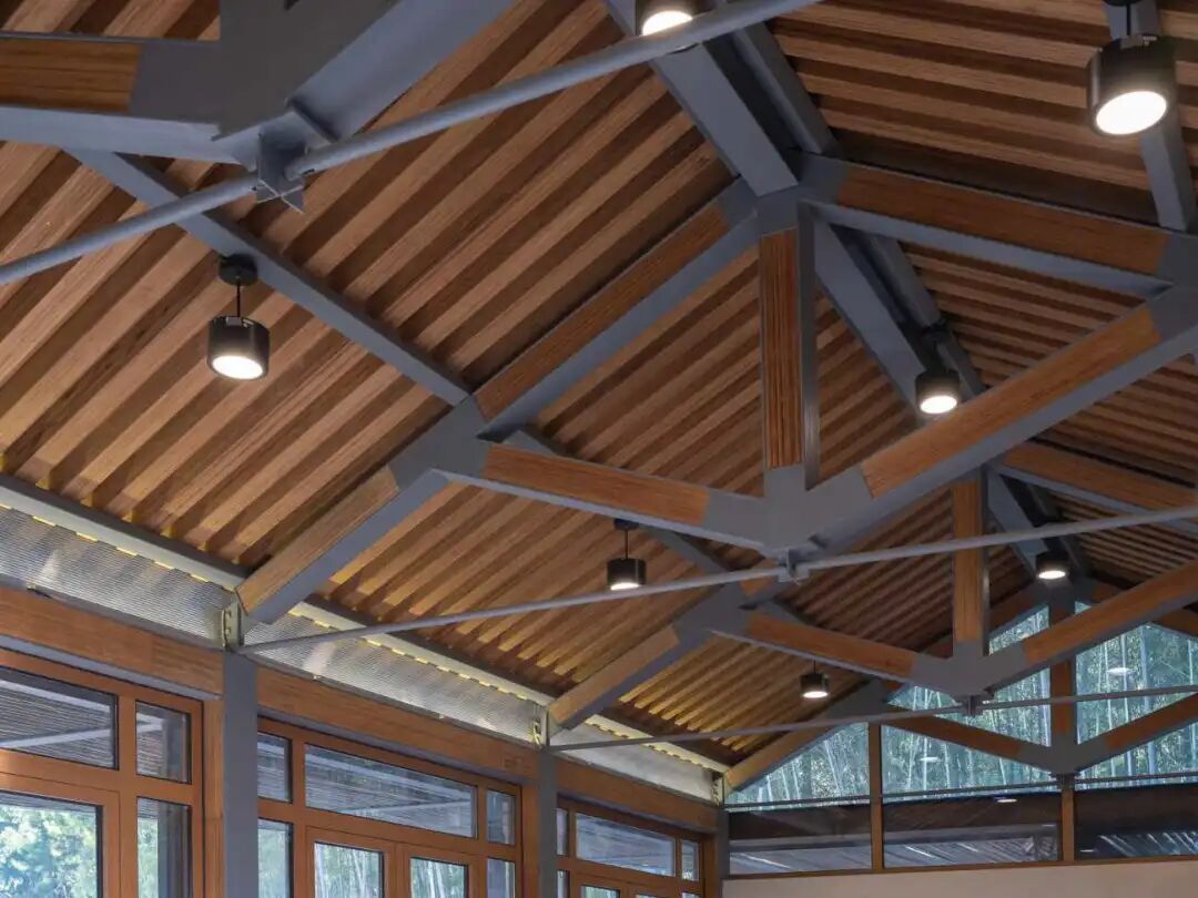 Lifting and ramming are the keys of this construction on the narrow site of the canal. The pitched roof of the building adopts the form of a small size of triangular steel roof truss, the connection between the roof truss and the column is hinged connection, and the roof truss is prefabricated in the factory and hoisted on site, and then welded with tie rods on site to resist side thrust, which is for the consideration of precise construction under on-site construction conditions. The structural layers of steel purlins, glued bamboo rafters and glued bamboo panels on the triangular roof truss make the construction show a clear ‘construction’ trace, which is a response to the original carport on the site. The corridor connecting these modern sloping roof buildings is a cross-shaped steel column with a section of 112*112, supporting a steel beam glass roof with bamboo poles shading louvers. In order to resist torsion, a small flange is welded at the web end of the cross shaped steel column, and the cavity formed thereby is filled with glued bamboo to make the column body appear thinner. These structures present a clear state of force, which complements the sense of force reflected by the bamboo poles in the bamboo forest around the site.