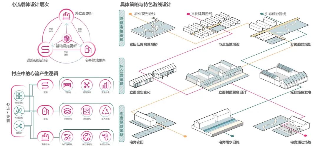 根据心流理论,首先要在载体设计上创造心流产生的要素。而村落焕新区的要素更新主要为建筑外立面、道路系统及宅旁绿地,并体现空间的随机变化。具体表现为通过农田低影响景观桥、节点场地增设和分级路网规划,增强道路系统品质;通过立面凹凸虚实、材质颜色统一与光伏绿色设施建设,更新建筑风貌;通过生产性、生活性、生态型宅旁绿地建设,更新村落环境。以上三方面策略组合形成农业观光、文旅休闲、生态旅游三条特色游线,实现视觉冲击、空间链接和景观互动。