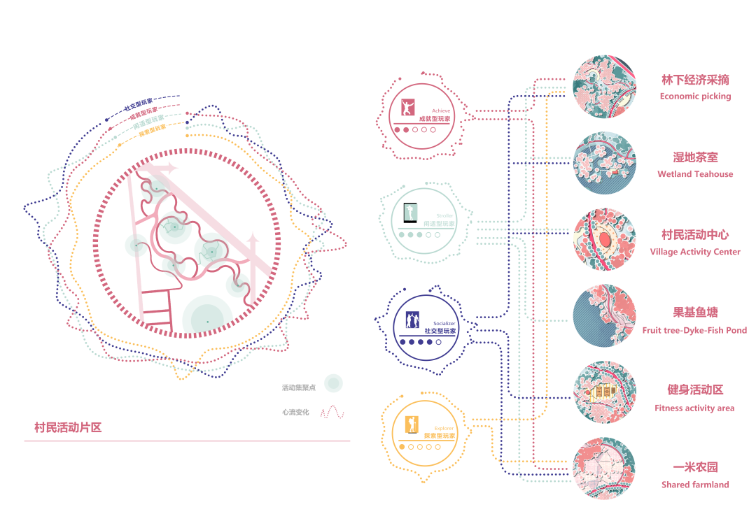 活力唤醒:活用心流理论,高效组合空间,发挥不同类型使用者在时空上的互补性以及社会层面的互助潜能,以丰富的游览体验层次和新颖的积分游园系统体现设计的在地性;