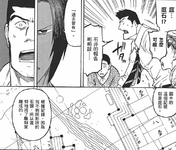 听到这个,木场反应过来,石井报告里说,现在院子里不是没有庭石的吗?京极堂却说,以前确实有,在设计图上甚至都标注好了庭石的形状。