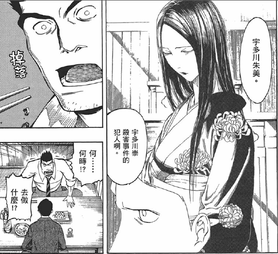 然后是与民江一同失踪的佐田朱美,不过在这回的宇多川案中,警方发现,现在被捕的宇多川朱美就是8年前的佐田朱美。