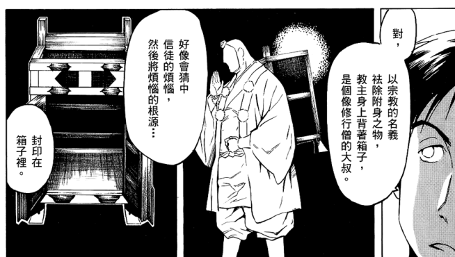 鸟口调查发现,那是最近新兴的一个教团,他们以宗教的名义驱逐附身之物,教主是个背着箱子,穿得像修行僧似的大叔,他好像能猜中信徒的烦恼,然后把烦恼的根源封印到箱子里。