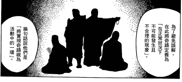 为了方便鸟口理解,京极堂也做了个简单的科普,像刚刚那种读心术一样的奇迹也是有分类的,京极堂把能引发奇迹的人分为四类,分别是宗教家、灵媒、占卜师和超能力者。