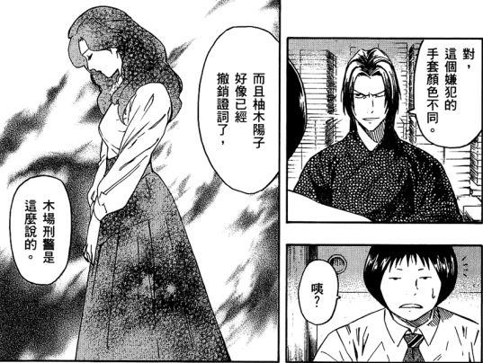 至于第三点就是京极堂刚得到的消息,久保有戴手套的习惯。青木闻言也是神色大变,很多案子里都有戴手套的黑衣男子出没,这是个很重要的疑点。