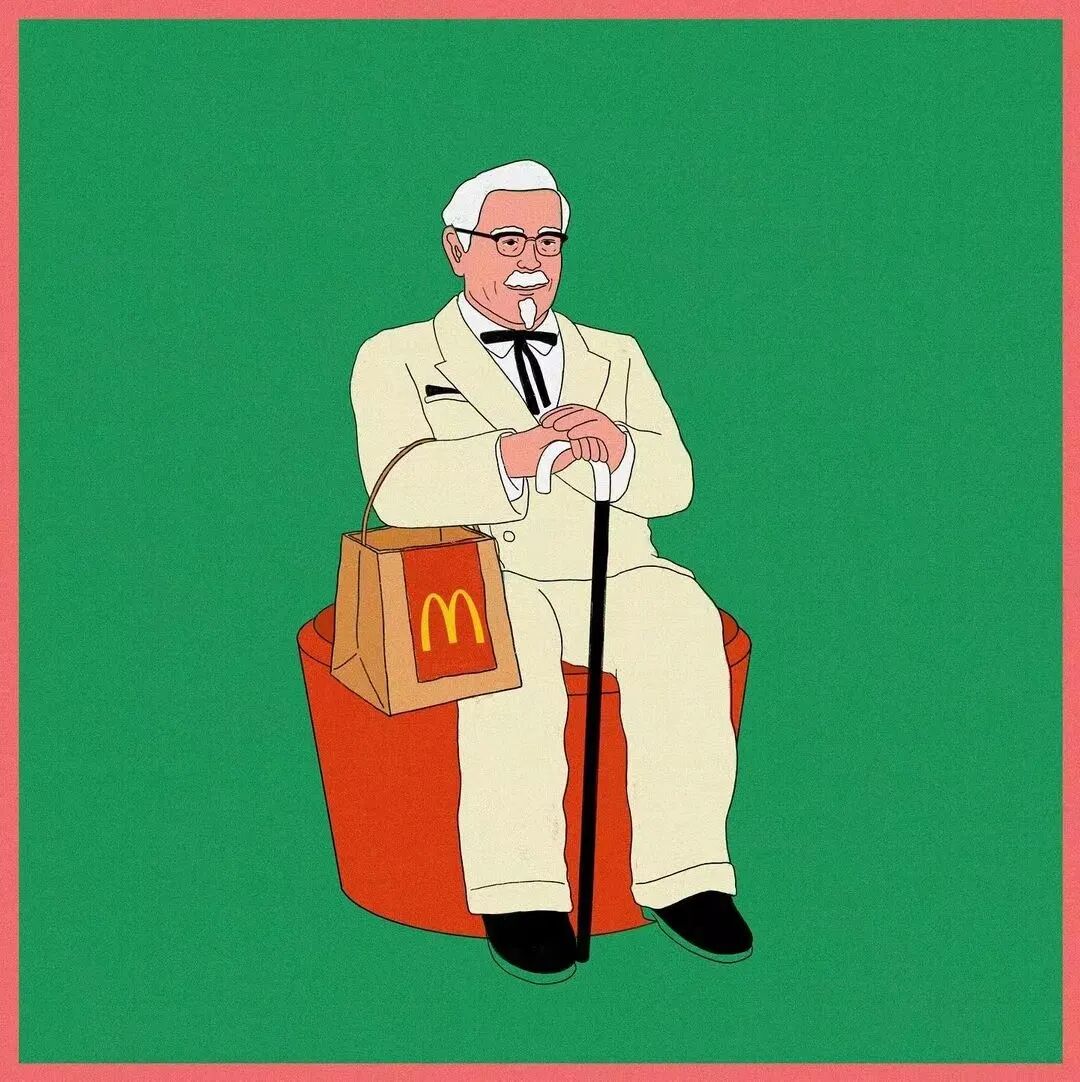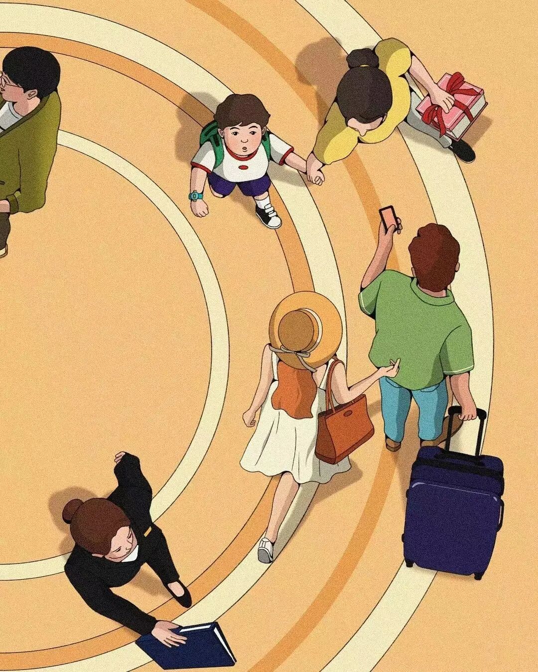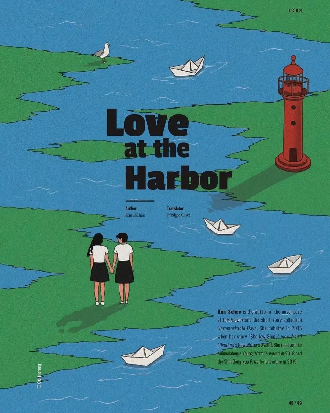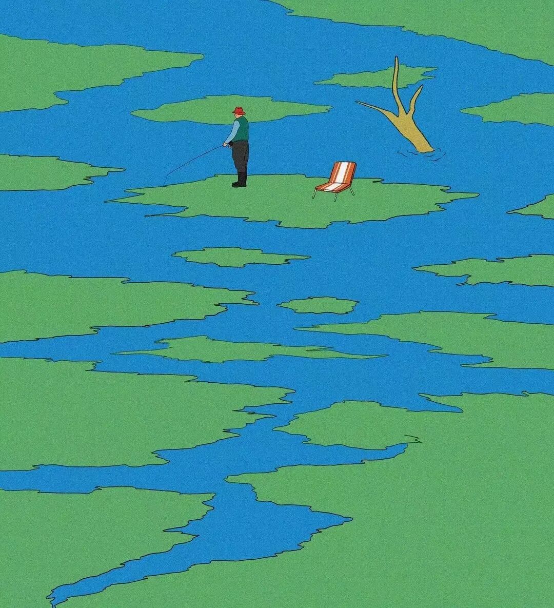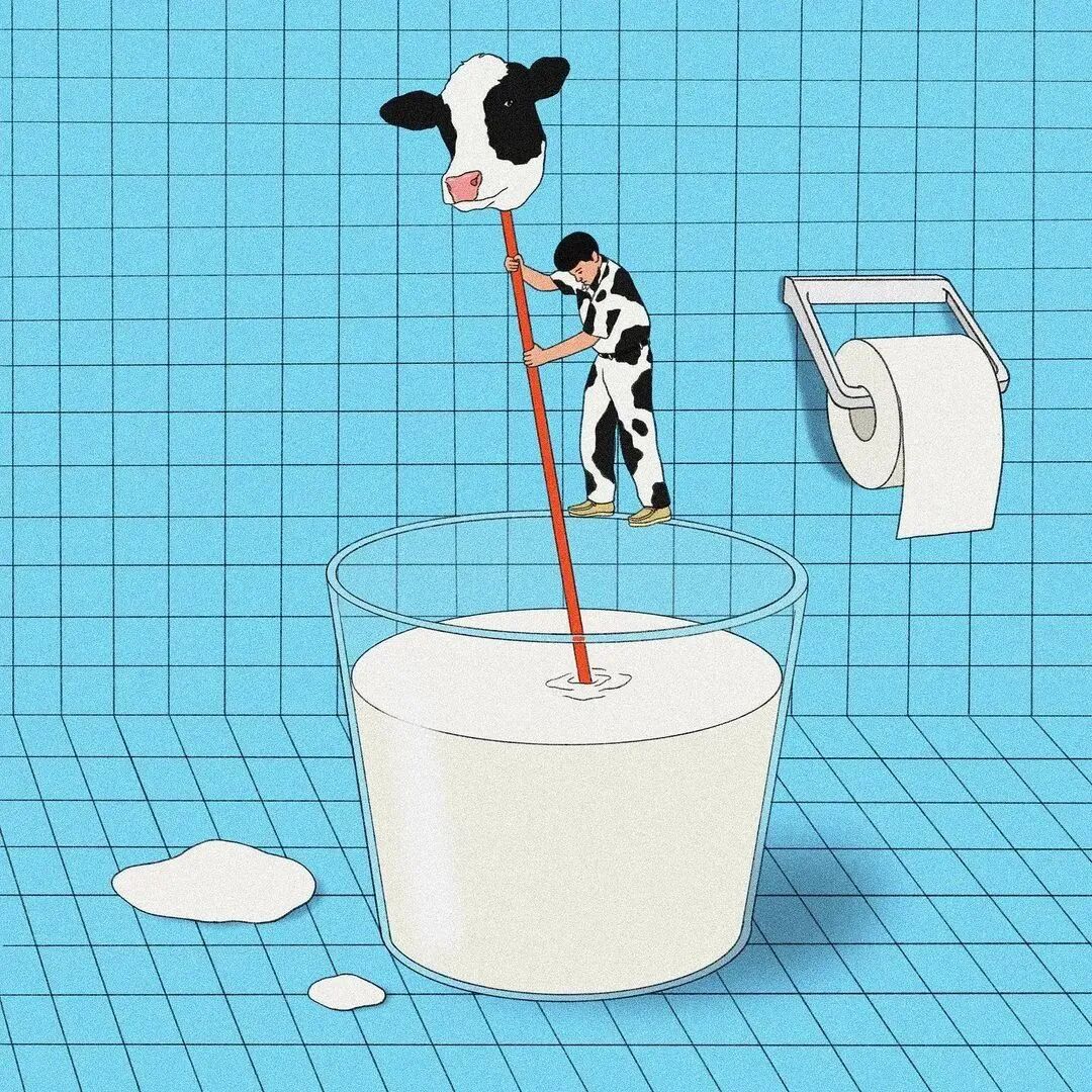 作品集2023-12-25 脑洞、讽刺、白日梦,全亚洲的社畜,都想跑到她的画里撒野 | 金城 近年来,无论是互联网还是现实,很多人都感受到了一股焦虑感。失业、内卷、内耗等状态令许多人疲惫。 什么时候能够从容一点,有趣一点? 学学韩国插画师Choi haeryung的画吧,用孩子气的天真,对抗无聊的一切。 看她的画,我们的第一印象是画面简单而宁静。 比如,她的《失踪》系列构建了一个田园诗般的环境。 女孩失踪了,她不在任何的学校与班级,也不在文件堆积如山的工位上,而是跑到了... 世外桃源。 她的背后,沙丘、躺椅、椰子树被分割到各处草地上,她与它们若即若离,但仍专心致志地看着什么。 这个世外桃源还来了其他的人。 两个穿着校服的女生手牵手站着,一个人盯着另一个人的侧脸,另一个人则看着远去的纸船,似乎可以感知到两个女孩之间暧昧不清的情感…… 一个男人,他可能逃离日常繁琐的工作,带了渔具在草地上钓鱼。 还有另外一个人,他把轮滑板当成小筏,高尔夫球棒当成船桨,抛下自己的汽车驶向远方。 在这些画中,我们感受到了梦幻式的宁静: 河水静静流淌,纸船慢慢地移,鸽子好像在等船再靠近点,扑腾下翅膀准备搭个便车。 她的画好像就是如此意识流,让人感觉宁静忧伤,难怪业界人士评价她的画用了白日梦这个词。 这种白日梦,她是从小做到大的。 上学时,她就把时间花在构建各种各样的角色上。 然后,她会迫不及待地与朋友们分享。 那是学生时代的白日梦,惬意而轻松,它们从脑海里产生,再从笔尖流泻出来,构成一幅幅如梦似幻的画面: 带着潜水镜,和群雁遨游在碧蓝天空中。 把美神维纳斯当成换装模特,看看哪件衣服更好看? 肚子痛的时候,笔下也妙趣横生:肠子里面好像有个小人在捣乱... “我通常从互联网上获得灵感。如今,互联网已成为日常生活的一部分”,白日梦的来源原来是浩瀚的互联网海洋。 有了这些原材料还不够,还需要一点奇思妙想式的加工。 她说:“网上的灵感与想象混合,然后我创造了一个新的形象。” 吃的是草,挤的是奶。 网络上的繁杂信息成为了她白日梦的黑色燃料,催动着这天真机器不断加工、产出斑斓的幻想,让她的画充满了童趣,宁静,但也仍有因原料不纯而产生的淡淡哀伤。 哀伤的根源是什么? 可能从她带有讽刺意味的画作中可以窥探一二。 她喜欢用鲜艳的色彩、熟悉的日常场景,直到它们变成一幅充盈着讽刺的图景。 美国国旗上的星星,实际上是棒球组合而成。 数字货币把银行隔离成一座孤岛。 把新冠肺炎用一招本垒打,打到别的地方去。 窄窄的高架桥,底下房屋倒塌,汽车沉没,像垃圾场,存活的人们也似公车在走独木桥,岌岌可危。 纷杂的世界里,成年人为了金钱,埋头社交、工作。 然而,在脚步匆忙的众人中,却有一个孩子扬起了头与自己对视。 和孩子的对视,让自己也变成了孩子,而用孩子的眼光看世界,世界也变得单纯而多彩。 童趣也成了对抗枯燥世界的法宝。 比如,孩子们可以拿起放大镜观察周遭,把时间“浪费”在常人看来的微不足道中。 大人们的地中海是因为年龄的摧残,孩子能爬到头顶像插秧似的拯救一番。 读书太困了,就躺在书上睡大觉,让梦里的小人替自己解决。 文件太多,堆成一座高山,就干脆躺在上面睡觉吧。 脑海里也有分岔路,小孩子也有他的迷茫,该走向何方? 在彩色的世界里,以梦为马。 把脑子摘掉,做一场心灵的瑜伽。 在孩子的世界中,没有什么是不可能的。 肯德基爷爷能给麦当劳作宣传,咬了一口番茄,其实是苹果;不顾及身材,轻松实现薯片自由..... “我总是试图看到一个年轻孩子看到的每一个图像,尽管我不是一个小孩子了,但我认为我仍然有可能从孩子的视角出发。”她说。 她与自己有一套和解的方式,那就是用这小小的天真、无伤大雅的无赖,去对抗现实里大大的无奈。 有人说,看她的插画是一次宁静祥和的正念之旅,在精神紧张,寻求心灵安慰的时候,甚至有治疗的作用。 她的画,会让人想起小时候飞行的梦,梦到基调总是欢乐。 而长大后,成年人忙于都照着别人的模板生活——鸡娃,养娃,996、北漂广漂沪漂,中年失业...... 插画师所处的韩国也是如此。 前不久,韩国有300多万成年人啃老,20岁以上年轻人的社会活动参与率也创造历史新低。不断加剧的老龄化,也让韩国不堪重负。 时代的重压,让人闯不过气来。 2020年疫情距今即将第三个年头,Choi haeryung把人们居家隔离的百无聊赖,烦闷,用插画的形式表达了出来。 红色门内,孩子的一句吐槽,是当下年轻人真实心声。 也许是过分的迷茫,让插画师Choi开始创作了失踪这一系列画作,她急需在这高压的节奏下安静下来。 “我真的很喜欢这个系列。” Choi说,“最近,我觉得少了点什么。我不知道为什么,我真的很困惑了一段时间。” 所以,她用这些充满童趣和脑洞的插画,来让心里安静一会。 “这里真的很安静。河流流淌缓慢,渔民们只是等待鱼。这就是我脑海里所需要的一切。” 在令人焦虑的当下,她逐渐选择做个面包,做个热狗,总之就是要随心随意,做个“时代的巨婴”。 她想,既然天真与世俗无法共存,那就让复杂和矛盾来得更尖锐些吧。 但是毕竟这是插画家,于我们普通人而言呢? 在纷扰复杂的当下,保持天真也是一件难得的事情。但是问题不大,生活无趣,尽情戏谑着,终有一天你会像她一样,找到天真与世俗之间的微