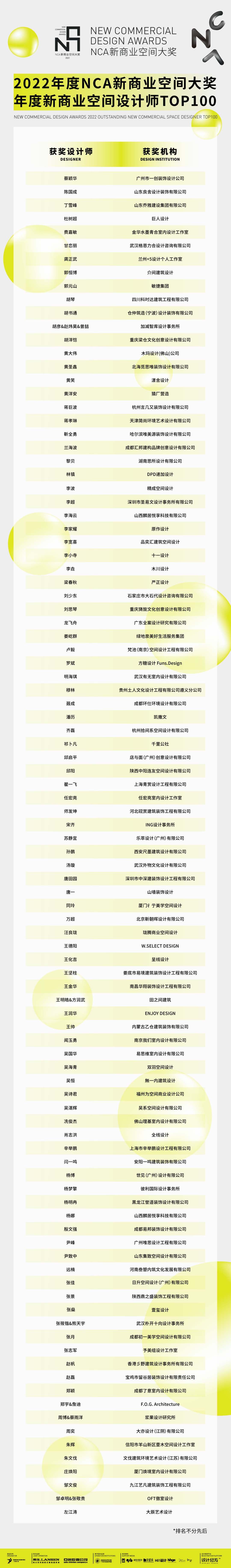 历经层层遴选,最终2022年度NCA新商业空间大奖-年度新商业空间设计师TOP100脱颖而出,感谢他们为2022年度新商业空间设计引领风向,为新一轮的新商业浪潮提供前瞻性参考!