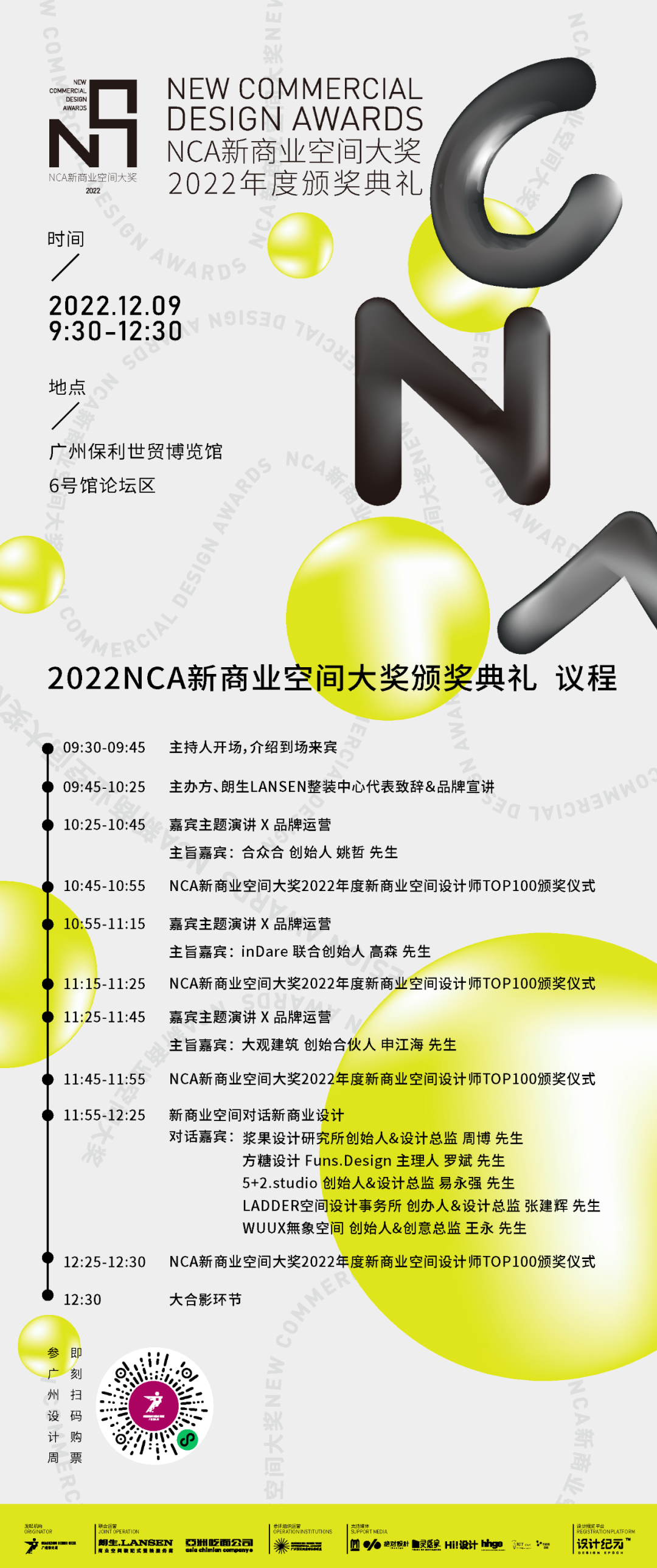12月9日上午9:30-12:30,「NCA新商业空间大奖 2022年度颁奖典礼」将于广州·保利世贸博览馆3楼 6号馆论坛区隆重举办,现场将会表彰致力于打造新商业空间做出卓越贡献的2022年度NCA新商业空间大奖-年度新商业空间设计师 TOP100进行颁奖,为卓越喝彩!