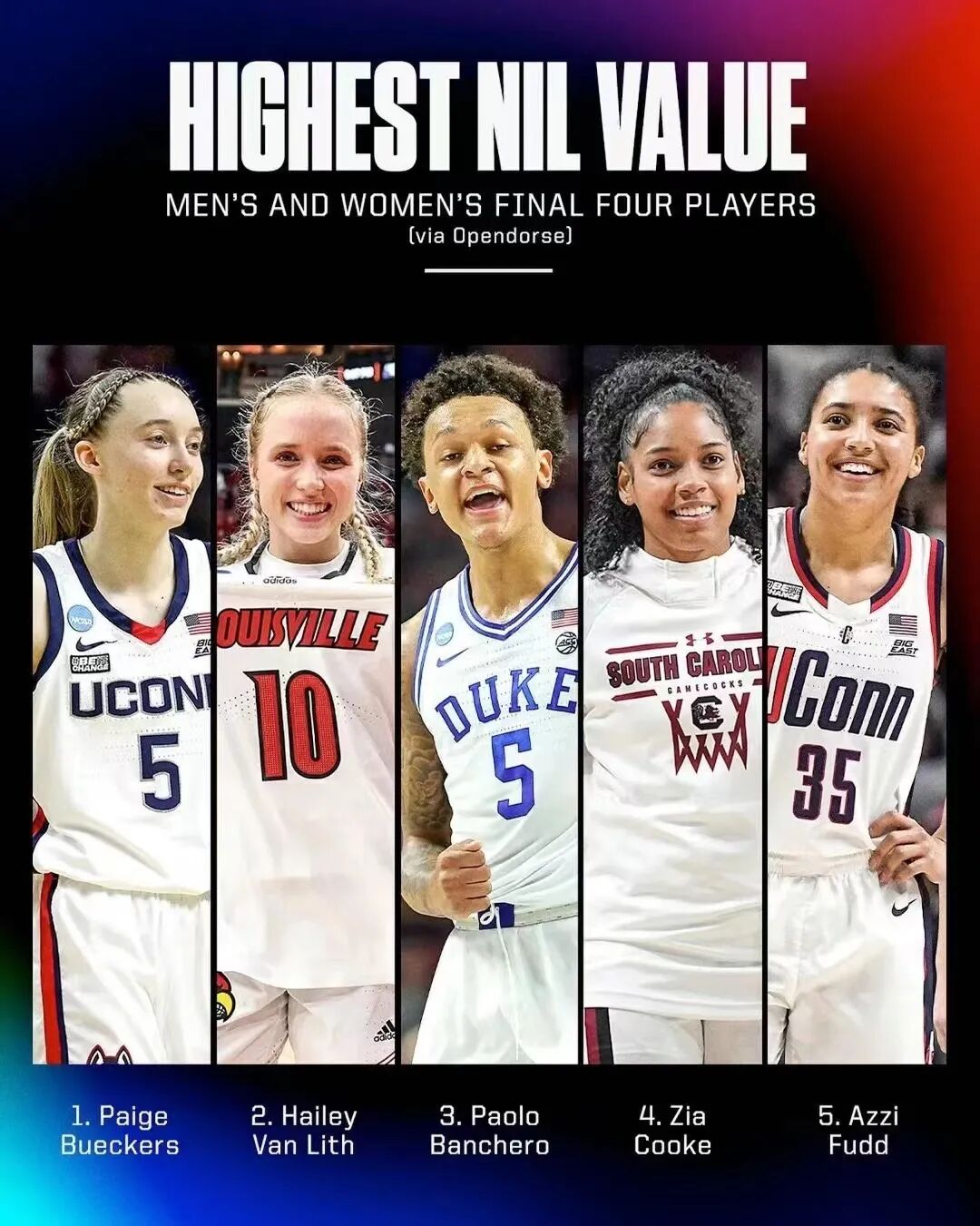 2022疯三男女篮最终四强,NIL价值最高的五大球员 图片来源:Opendorse