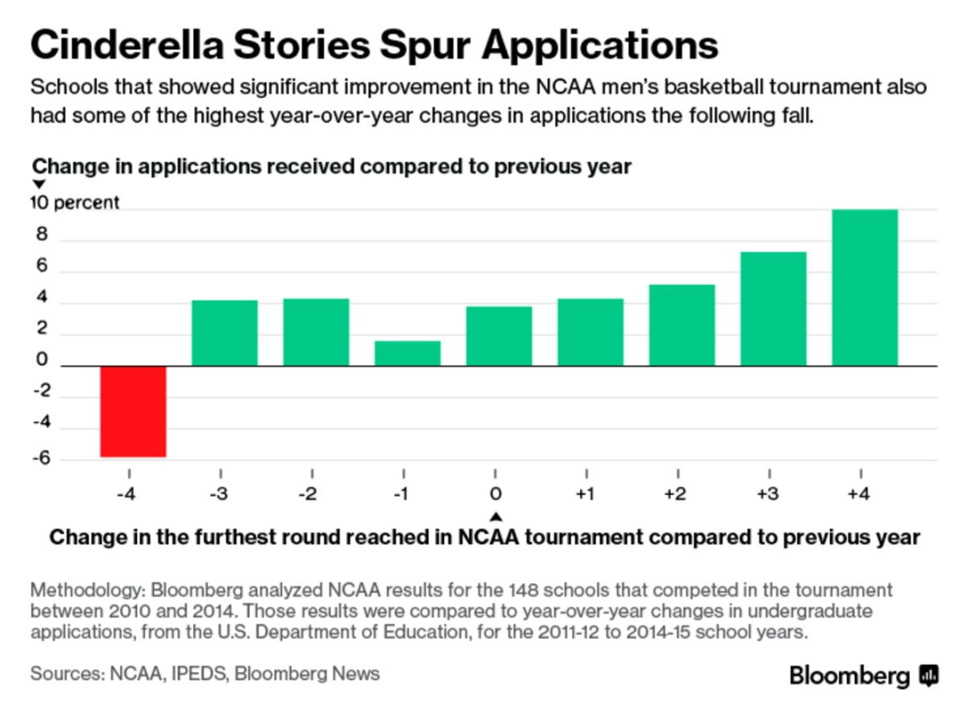 2020年西顿霍尔大学与戴顿大学多名学者的一份合作研究报告显示,私立高校在其篮球队成为疯三黑马之后的两个学年期间,新生入学的人数比例会有明显提升。