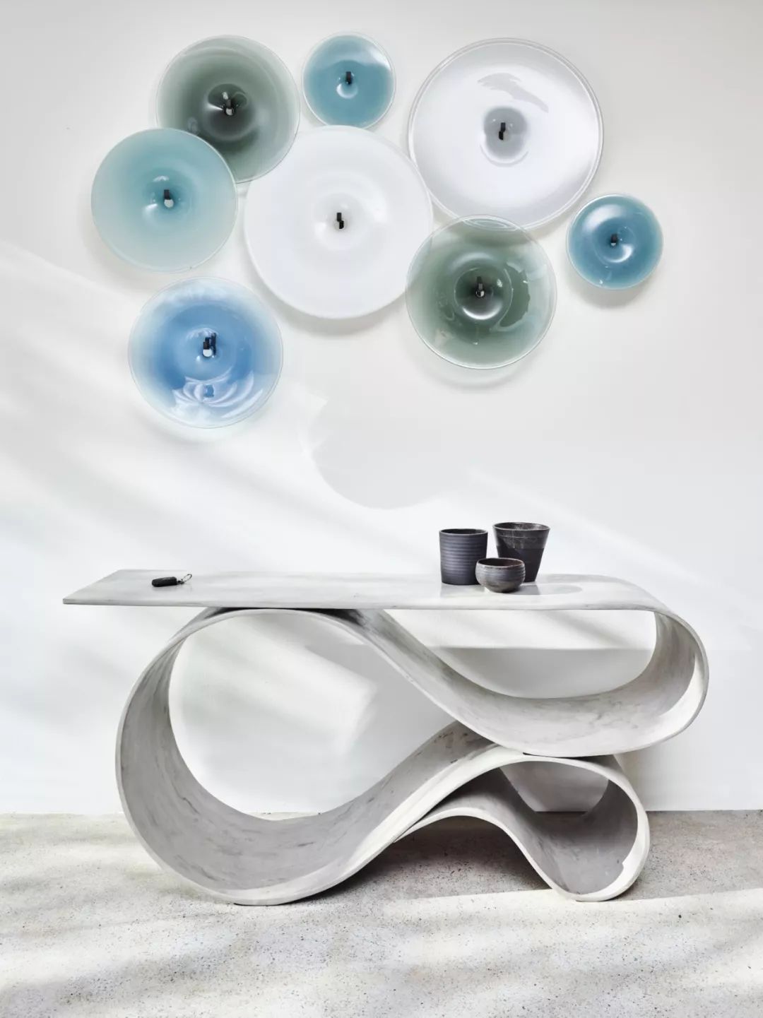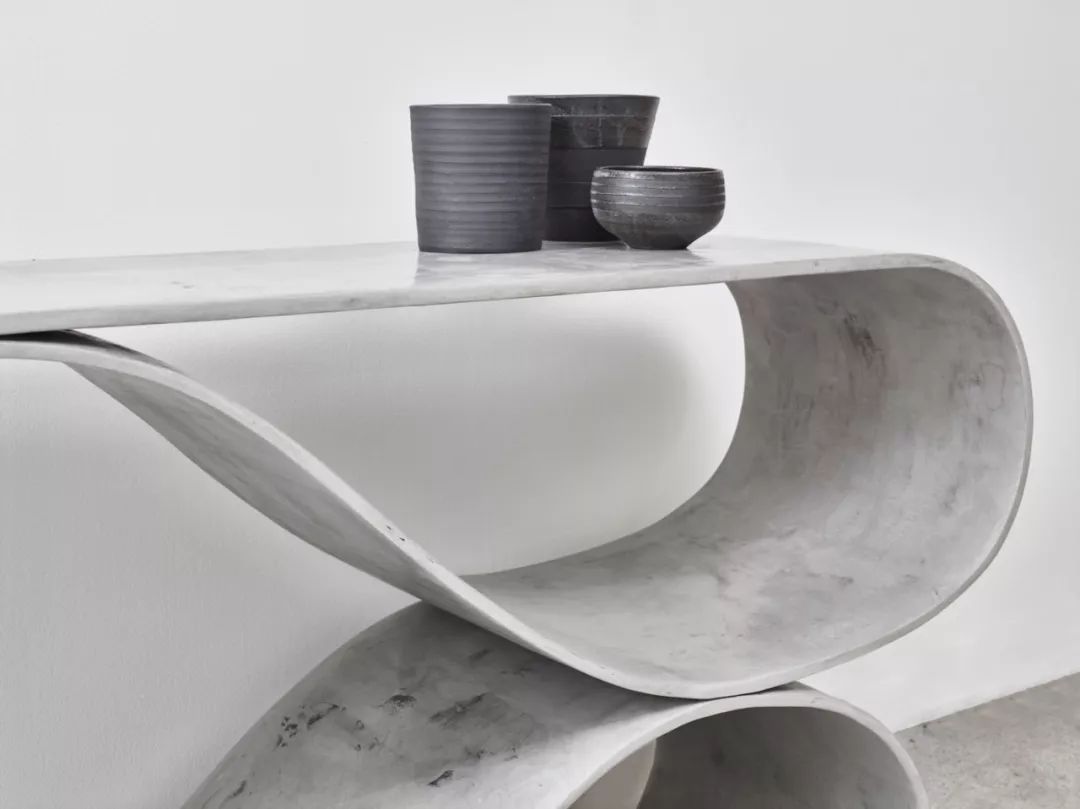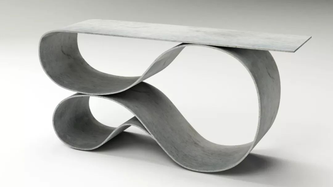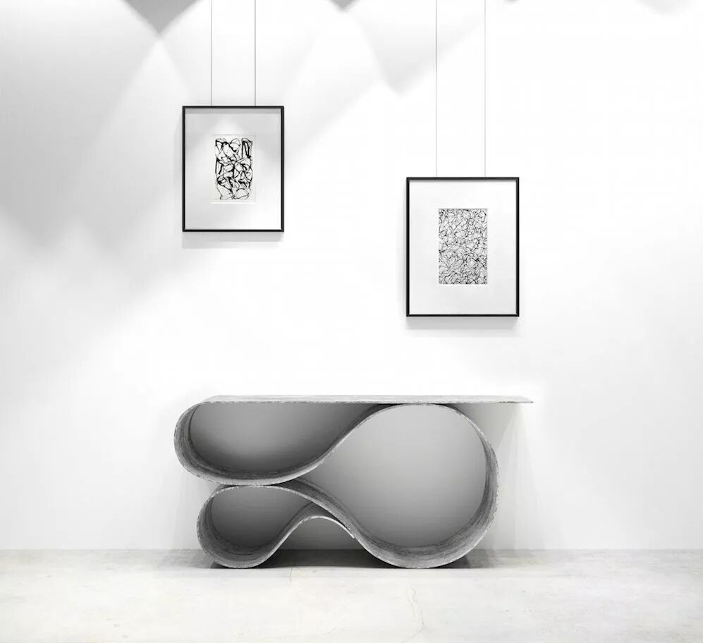 浸透了混凝土的织物在水合作用时会变硬,从而形成纤薄、耐用、防水耐火的混凝土层。这种独特的铸造和成型技术实现了桌子绝妙的带状结构。