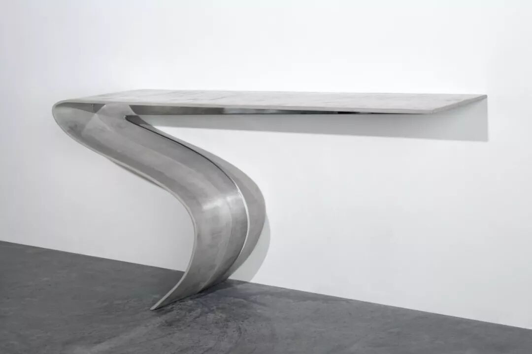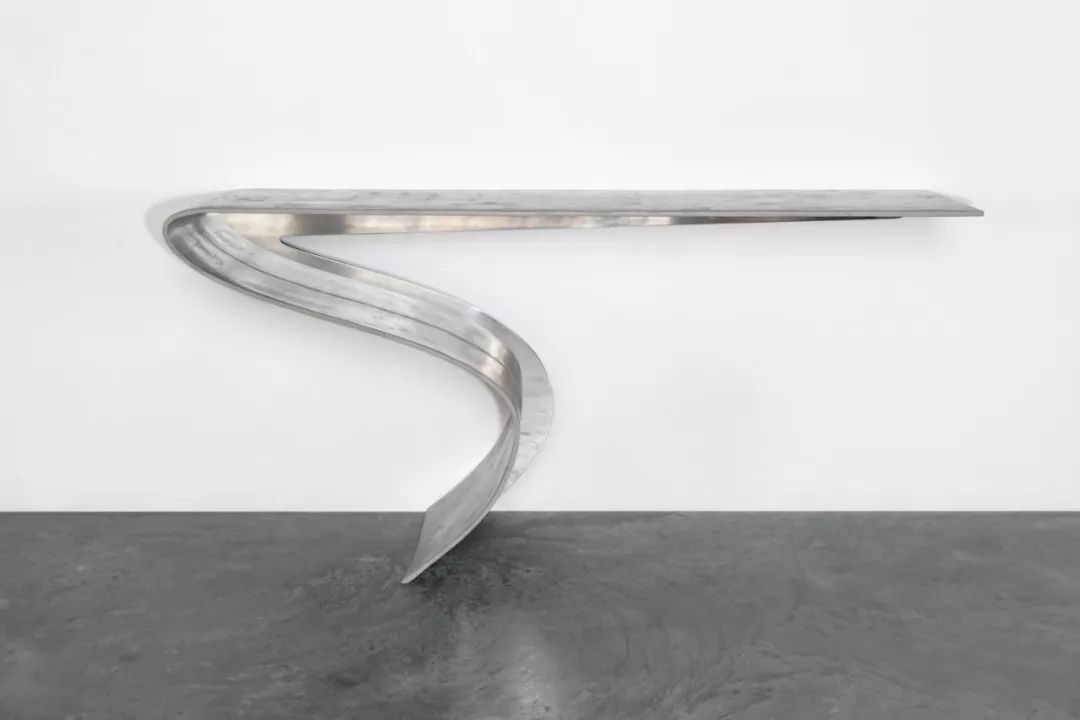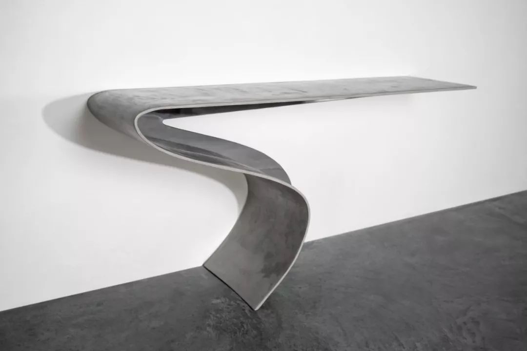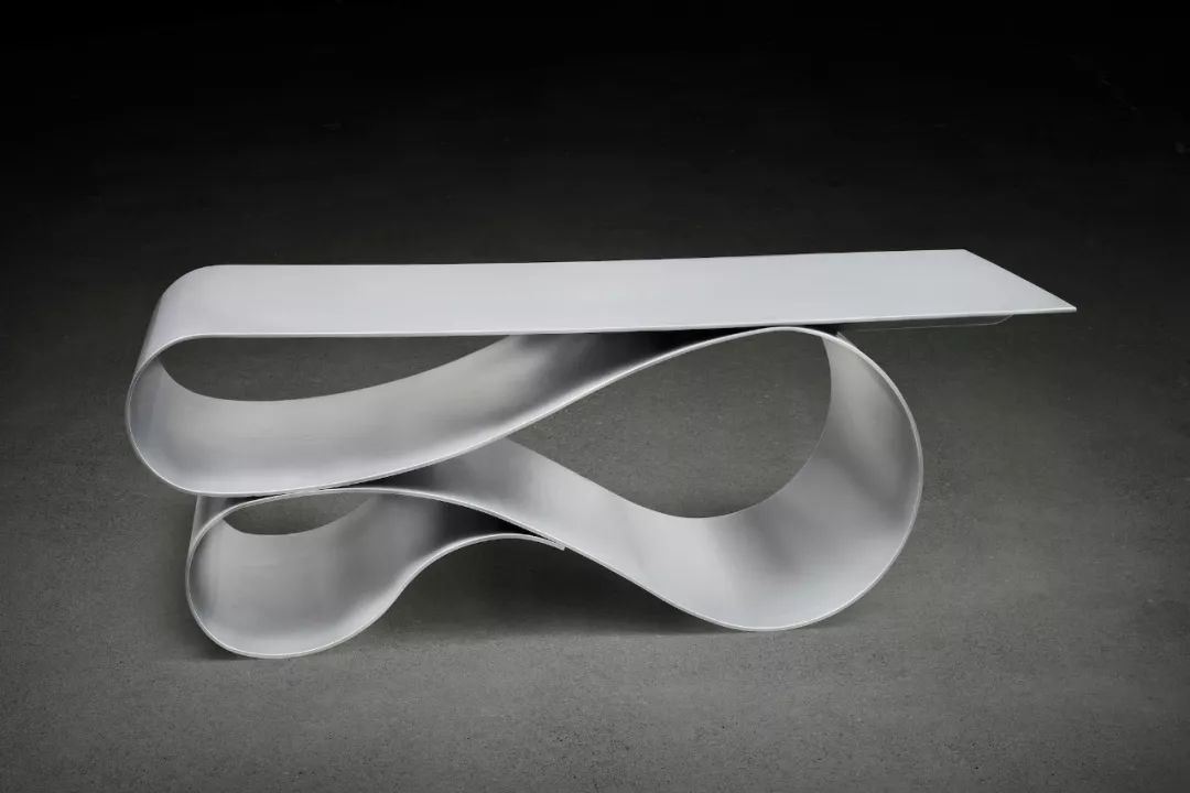 浸透了混凝土的织物在水合作用时会变硬,从而形成纤薄、耐用、防水耐火的混凝土层。这种独特的铸造和成型技术实现了桌子绝妙的带状结构。
