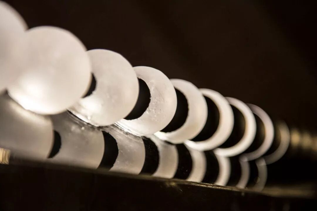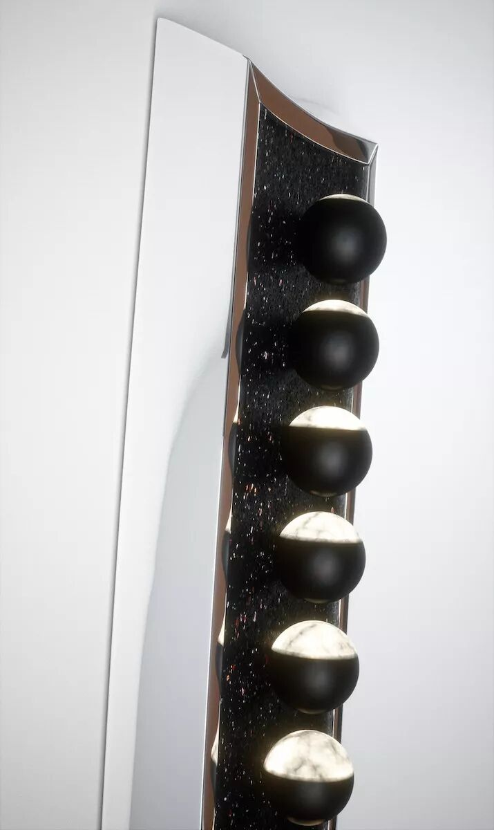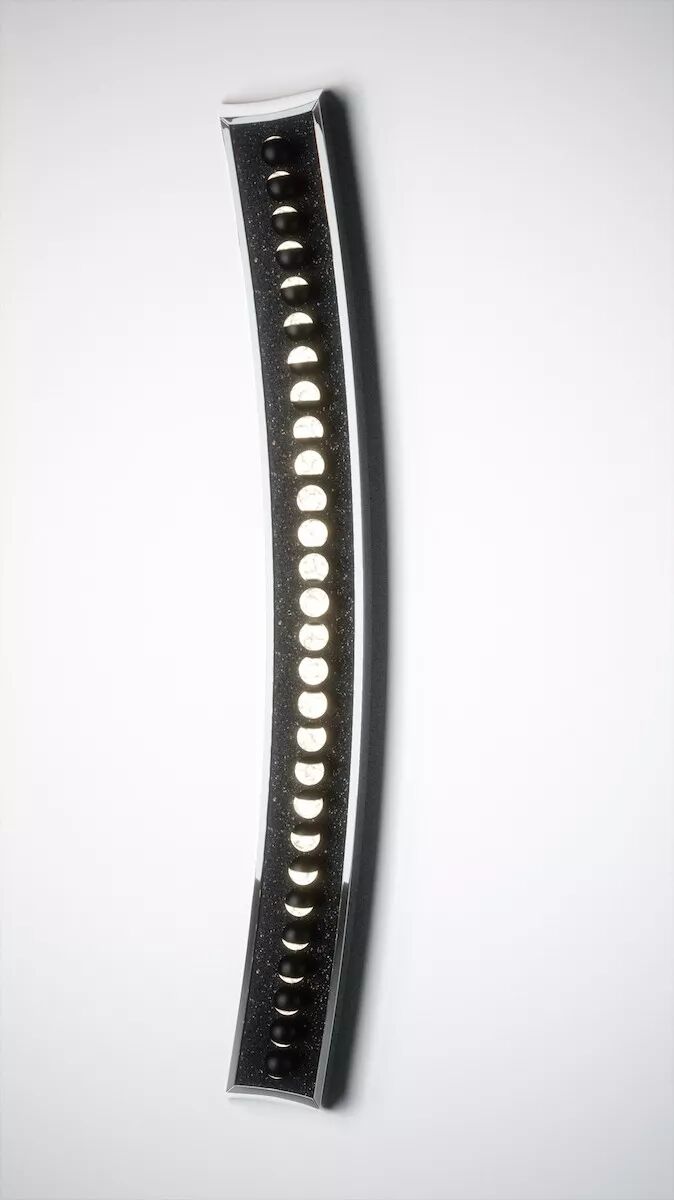 这款灯具由二十八个吹制玻璃球组成,球罩内部被手工涂成黑色,代表了月相的变化,十分迷人。