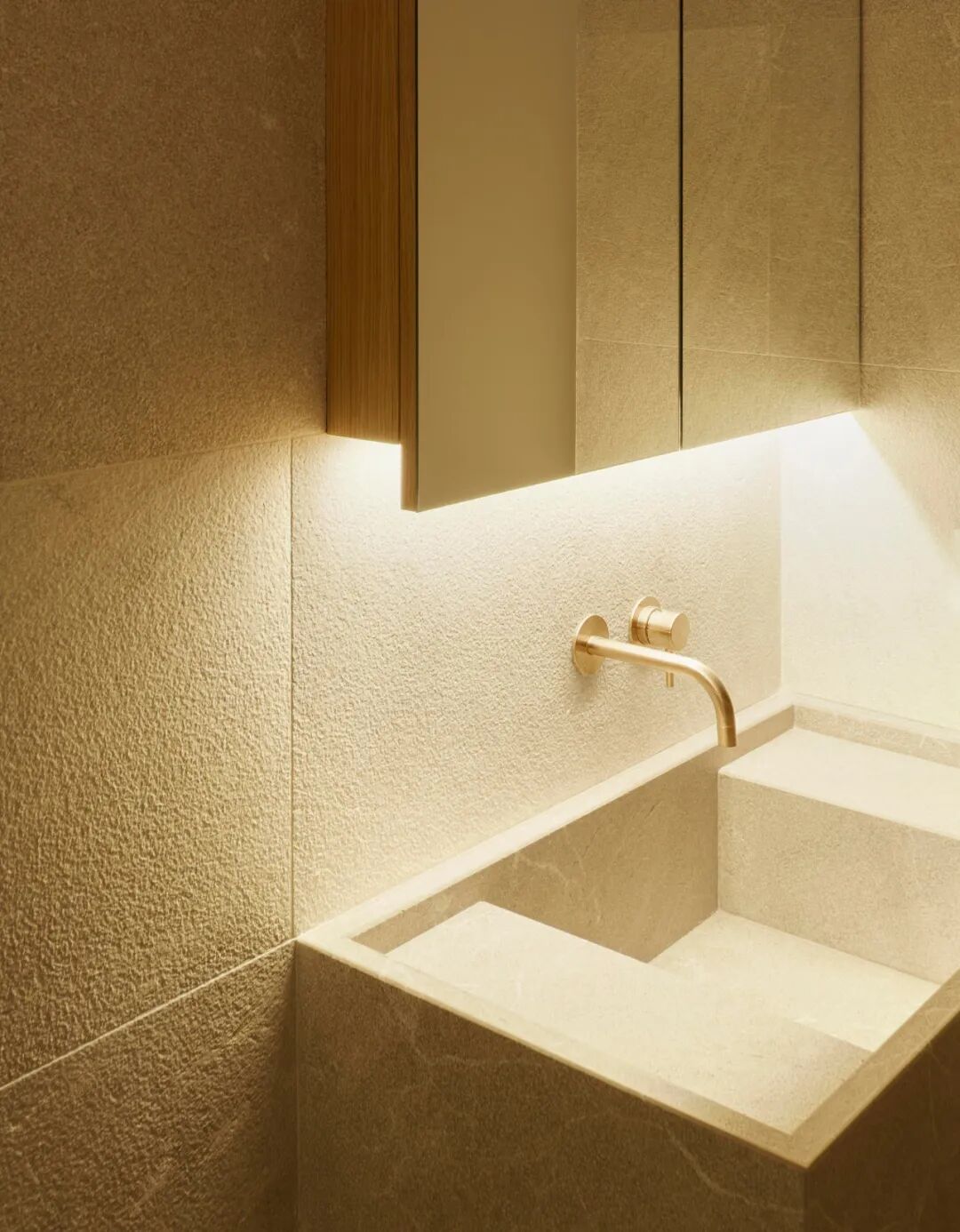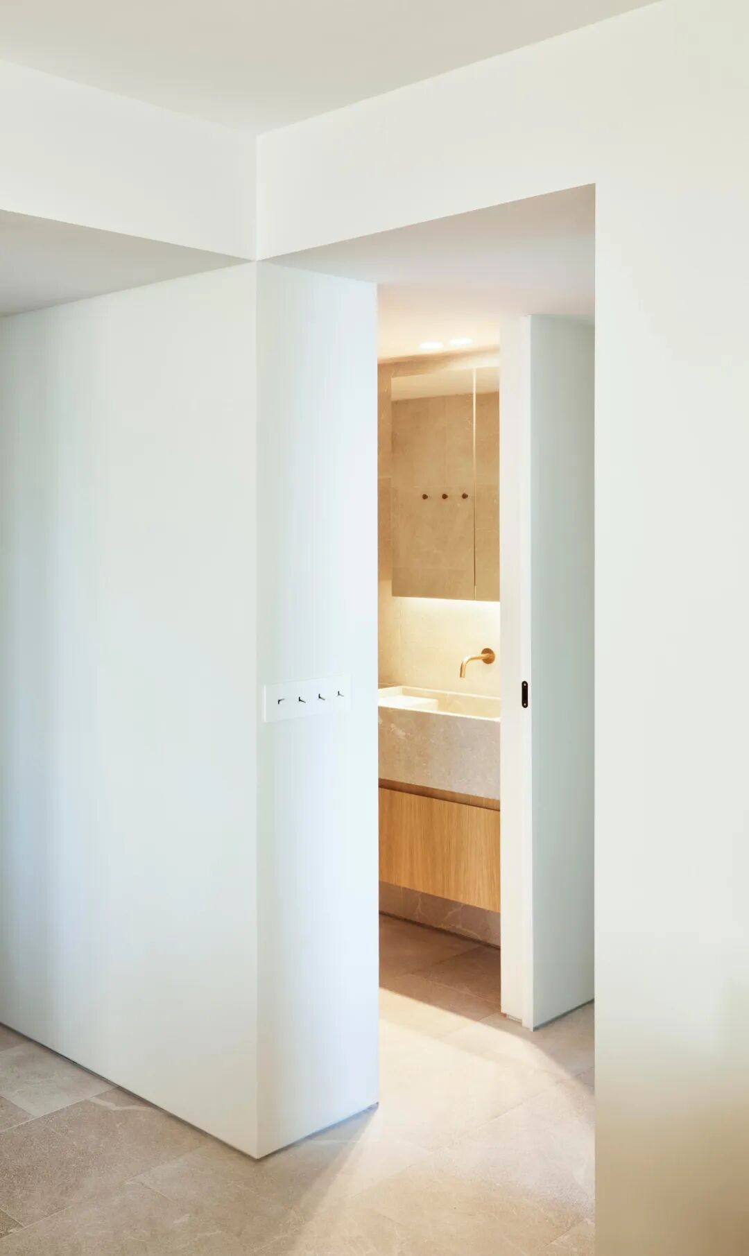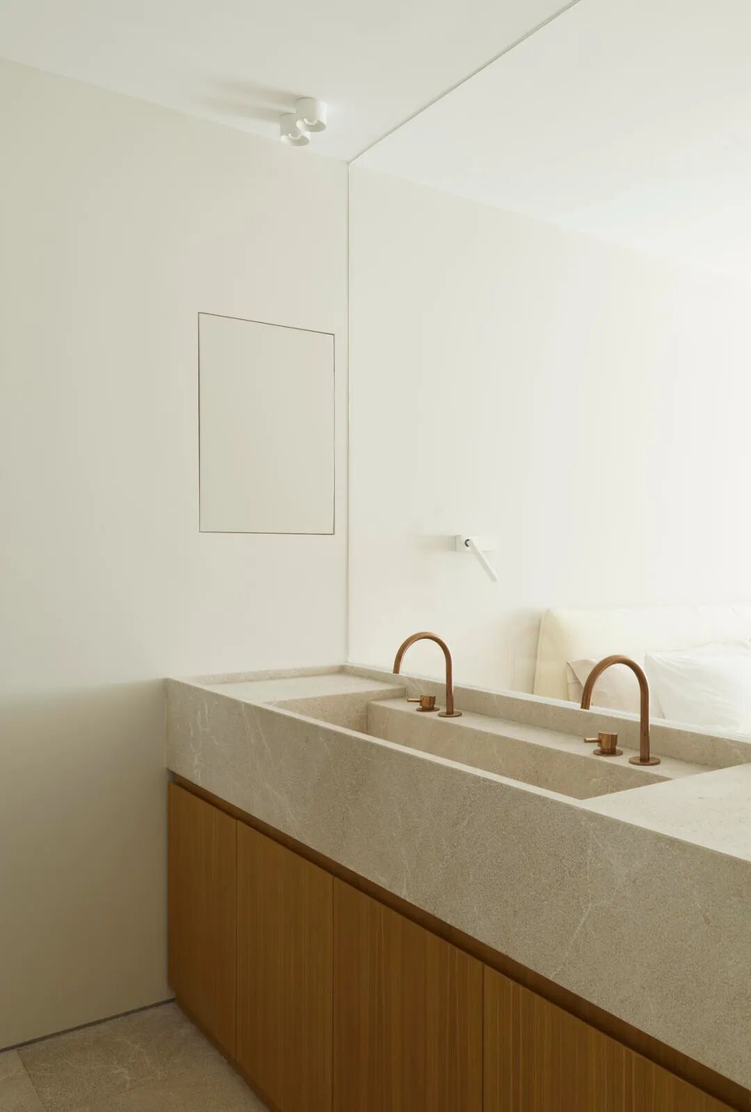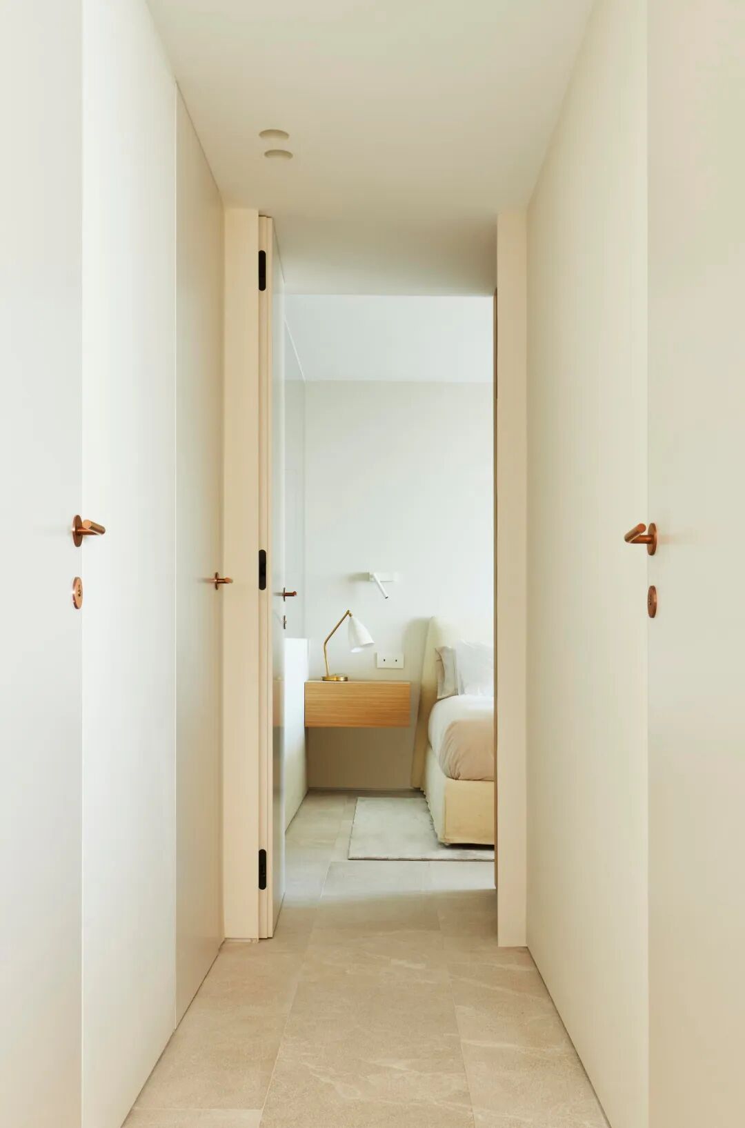 空间通过木镶板从大厅到厨房家具完全连接,完全定制设计和制造,与石材地板形成对比,创造一种温暖的感觉。