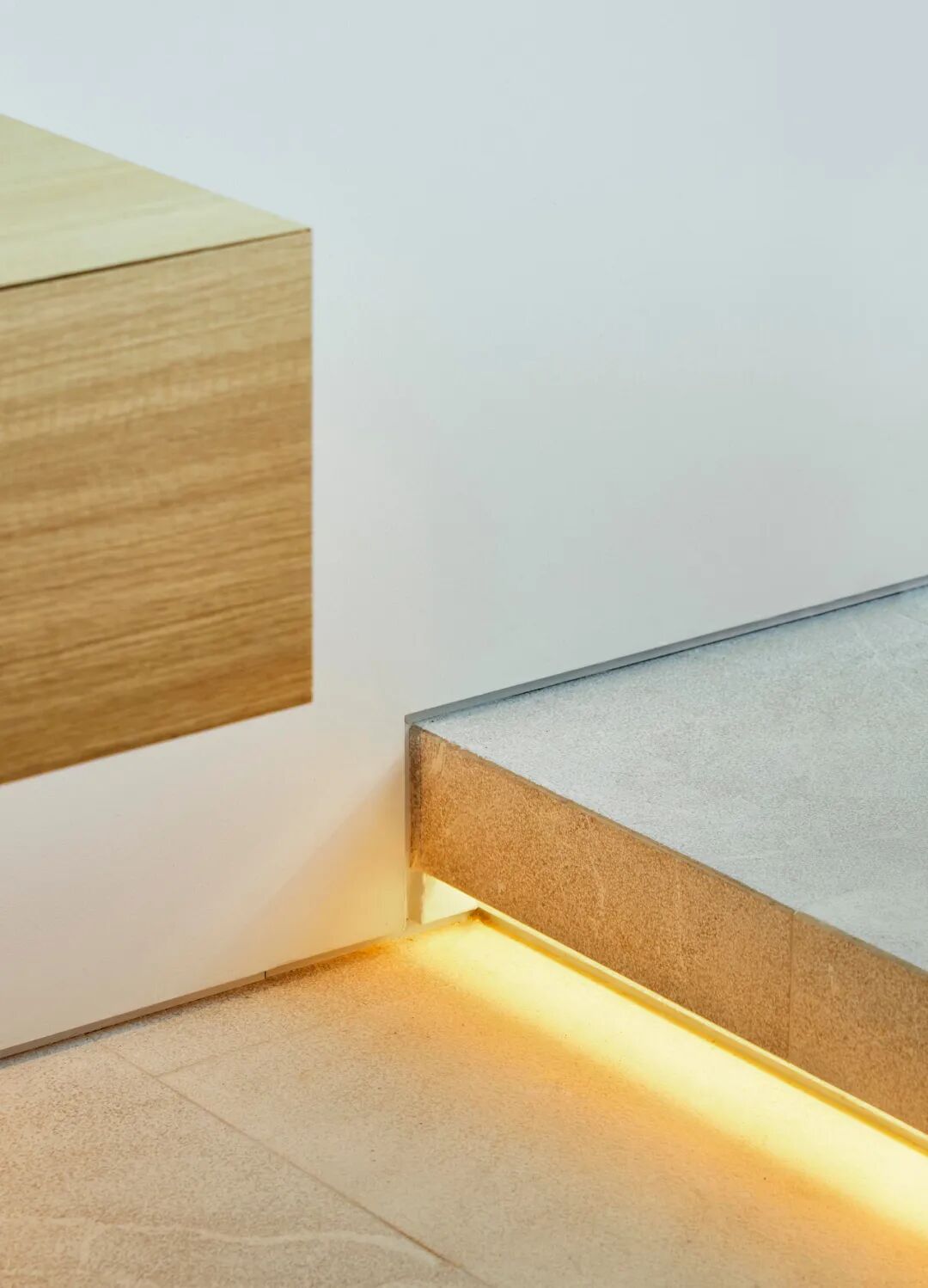 The space is fully connected through wood paneling from the hall to the kitchen furniture, which is completely custom designed and manufactured to contrast with the stone floor and create a sense of warmth.