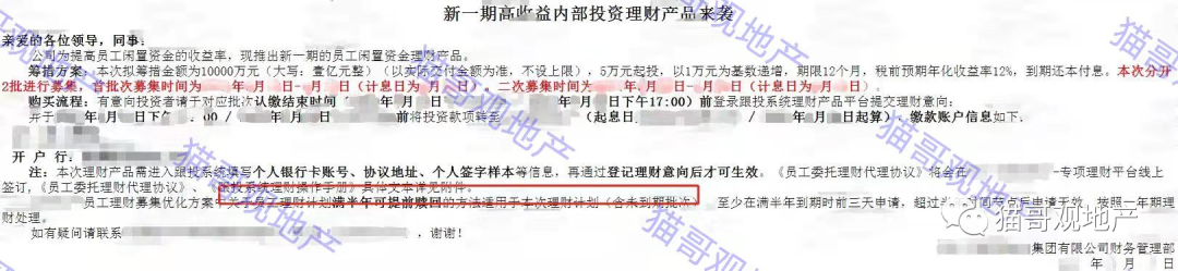 这家品牌房企,这两年也学某些头部房企,搞了不少内部理财,以高收益的名义,吸引员工把自己的钱投到公司里面。年化收益12%,收益真的很不错,猫哥看了一下都有点心动了,比之前X大的理财产品收益高多了。虽然不知道啥为啥收益这么高,这些钱都投了什么项目,这些项目会不会亏损,但是这个收益明显是给够了的。