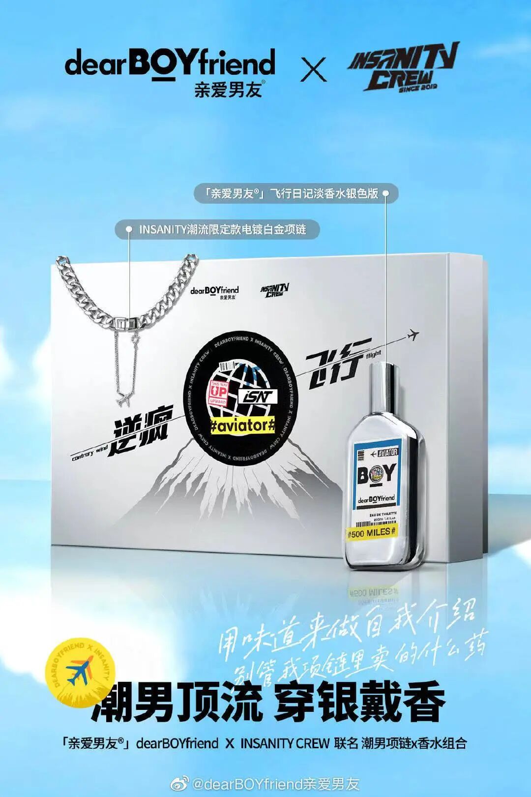 男士理容品牌dearBOYfriend亲爱男友近日携手Insanity Crew热极推出“逆疯飞行”潮流礼盒,礼盒内含飞行日记淡香水银色版和Insanity限定款电镀白金项链,飞机挂饰代表着银翼战士自由冒险的壮志。用穿银戴香为潮流男士加码。(来源:官方微博)