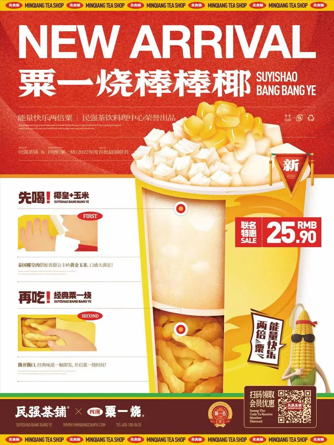 本土食材饮品品牌民强茶铺近日联合四洲粟一烧推出新品粟一烧棒棒椰,通过“饮食一体化”带来全新茶饮体验。生打椰融合玉米露,柔滑不腻,椰肉与嫩豆腐爽脆绵滑,混合经典粟一烧酥脆,享受边吃边喝的乐趣。(来源:胖鲸BotF未来品牌)